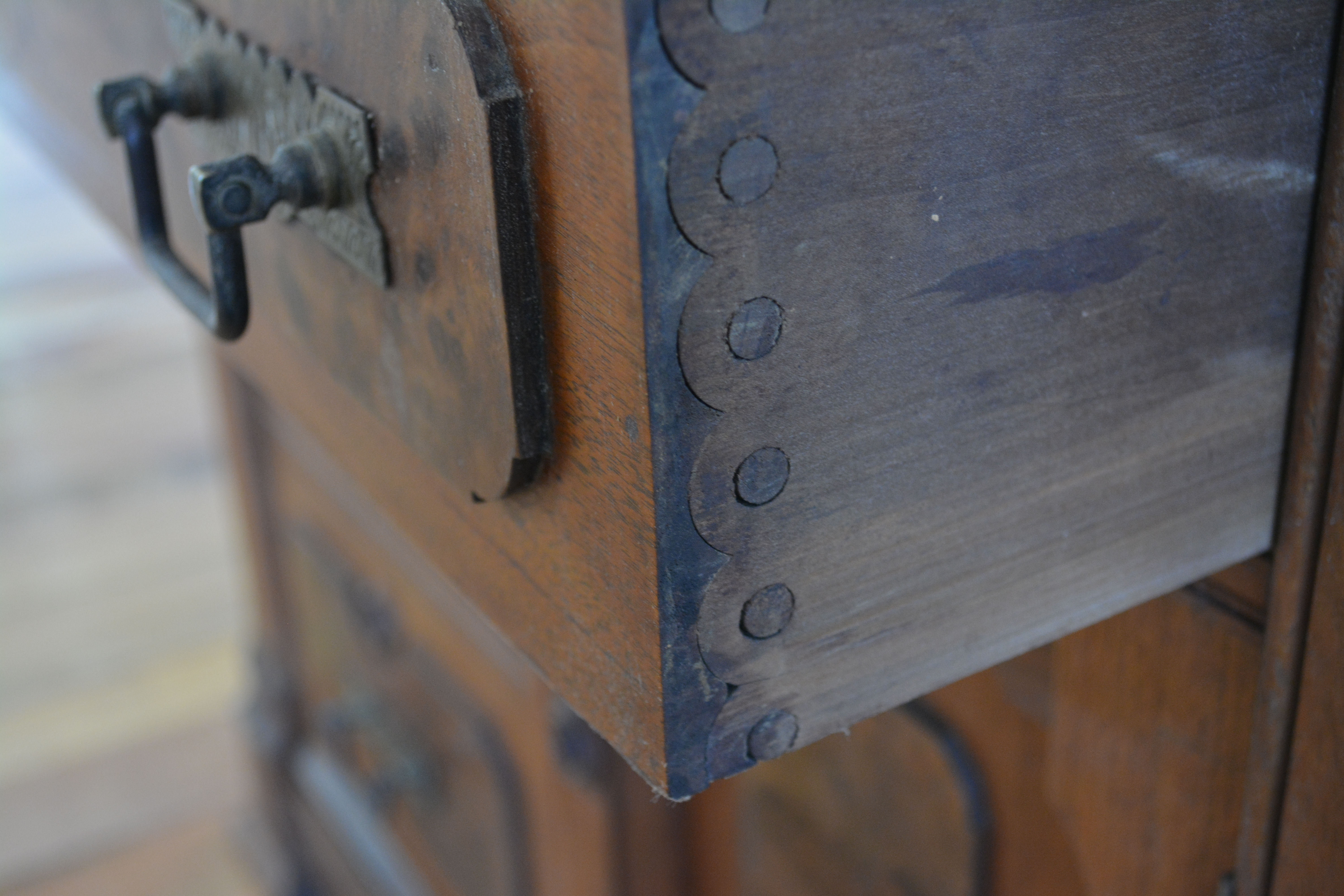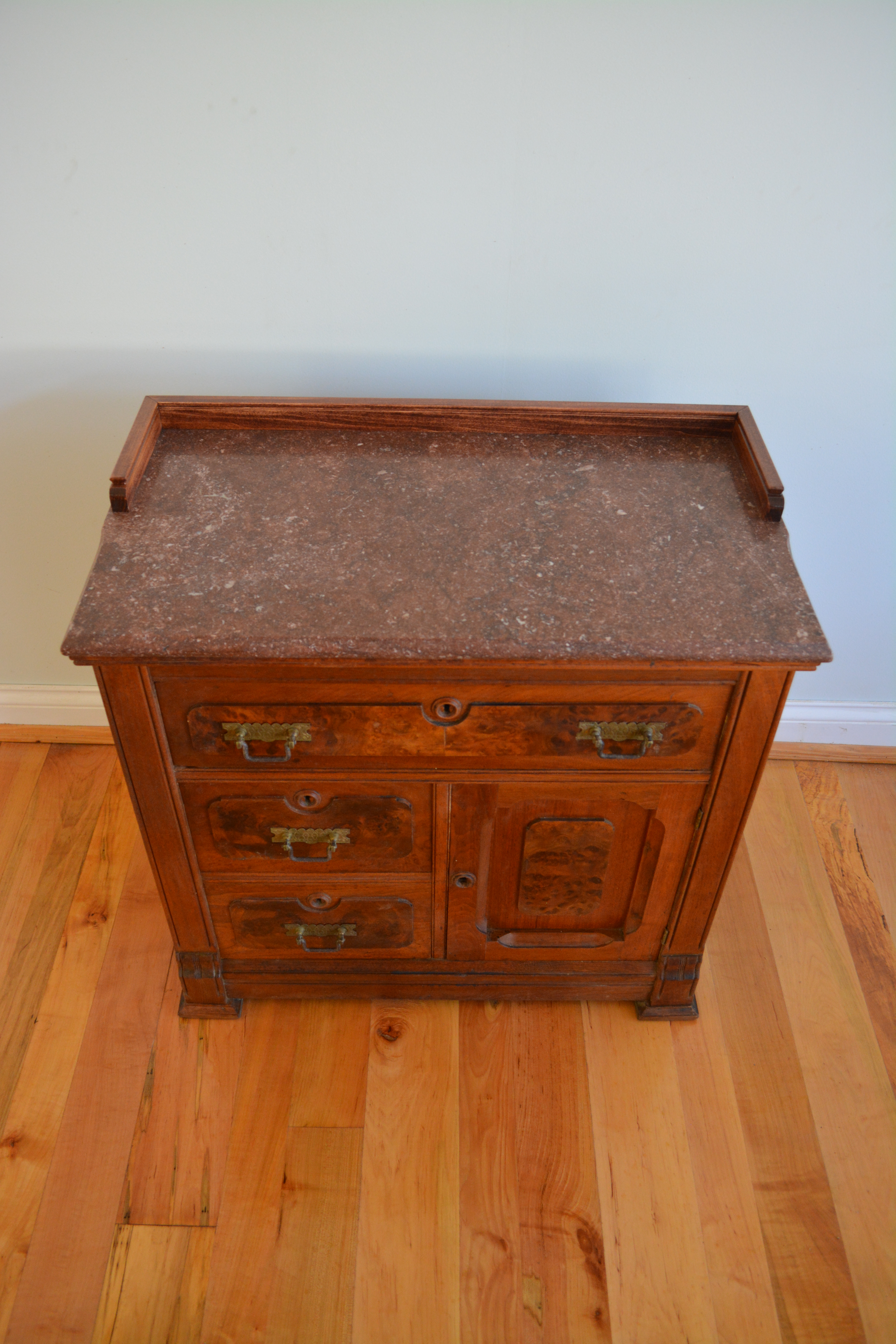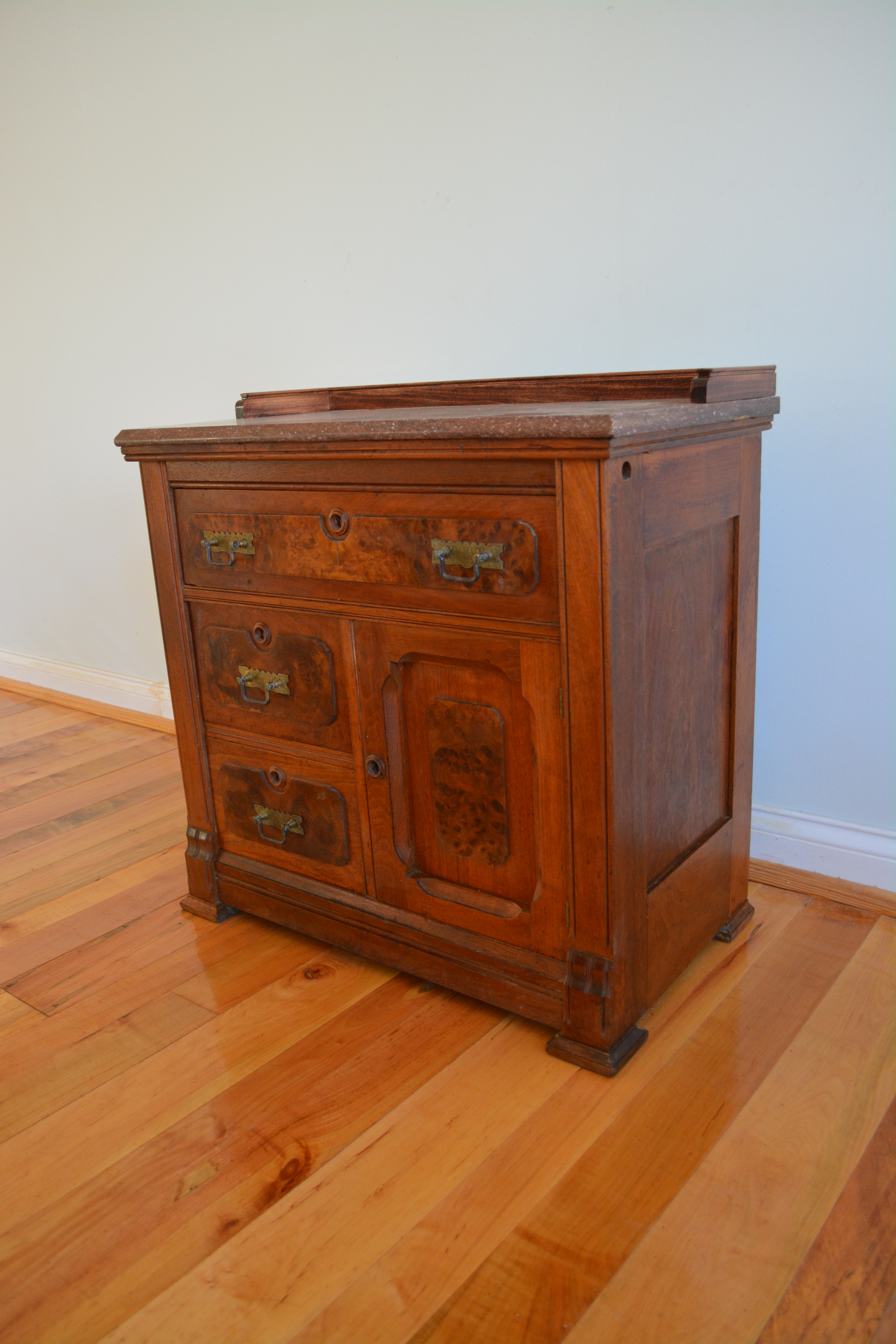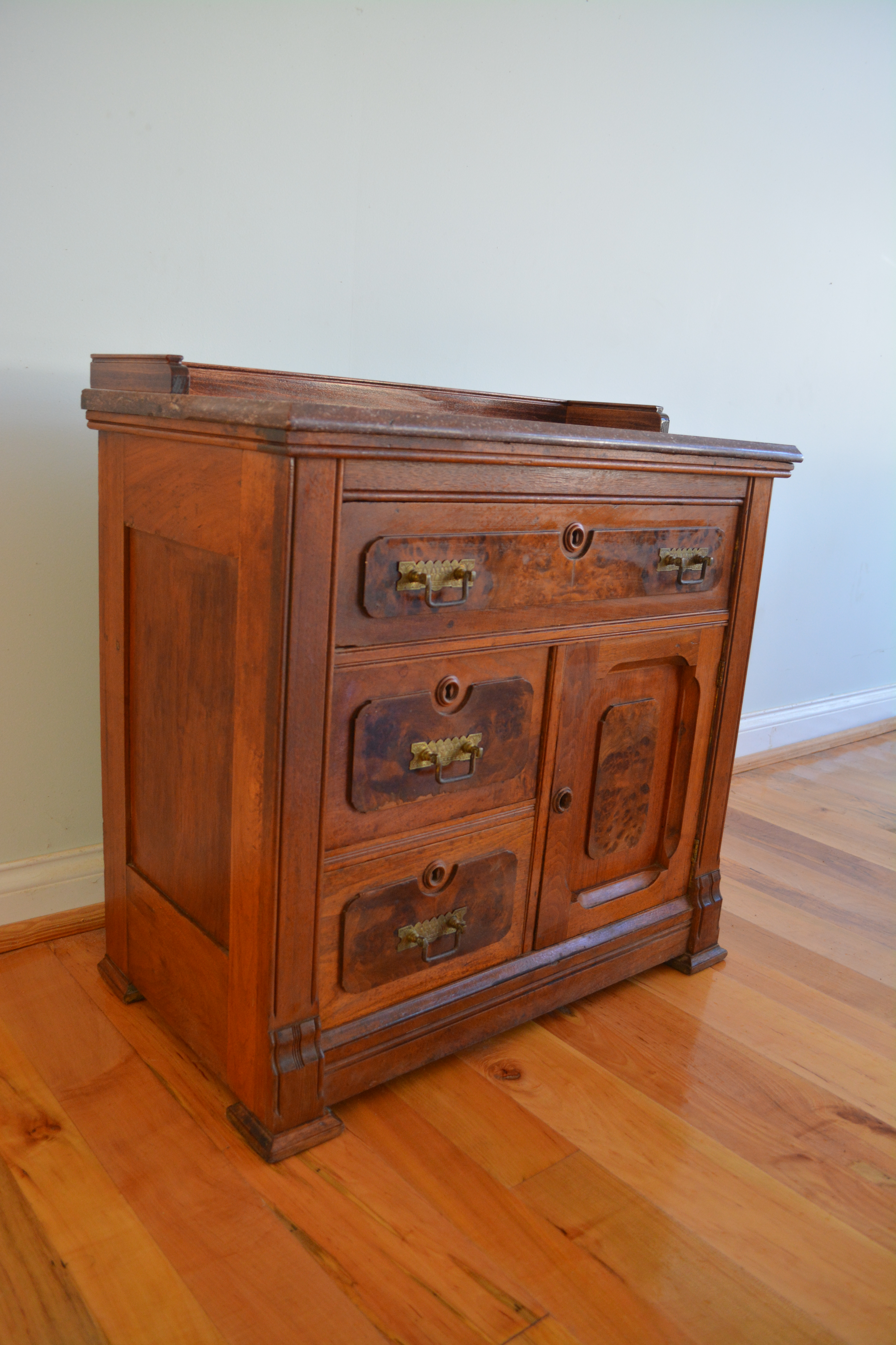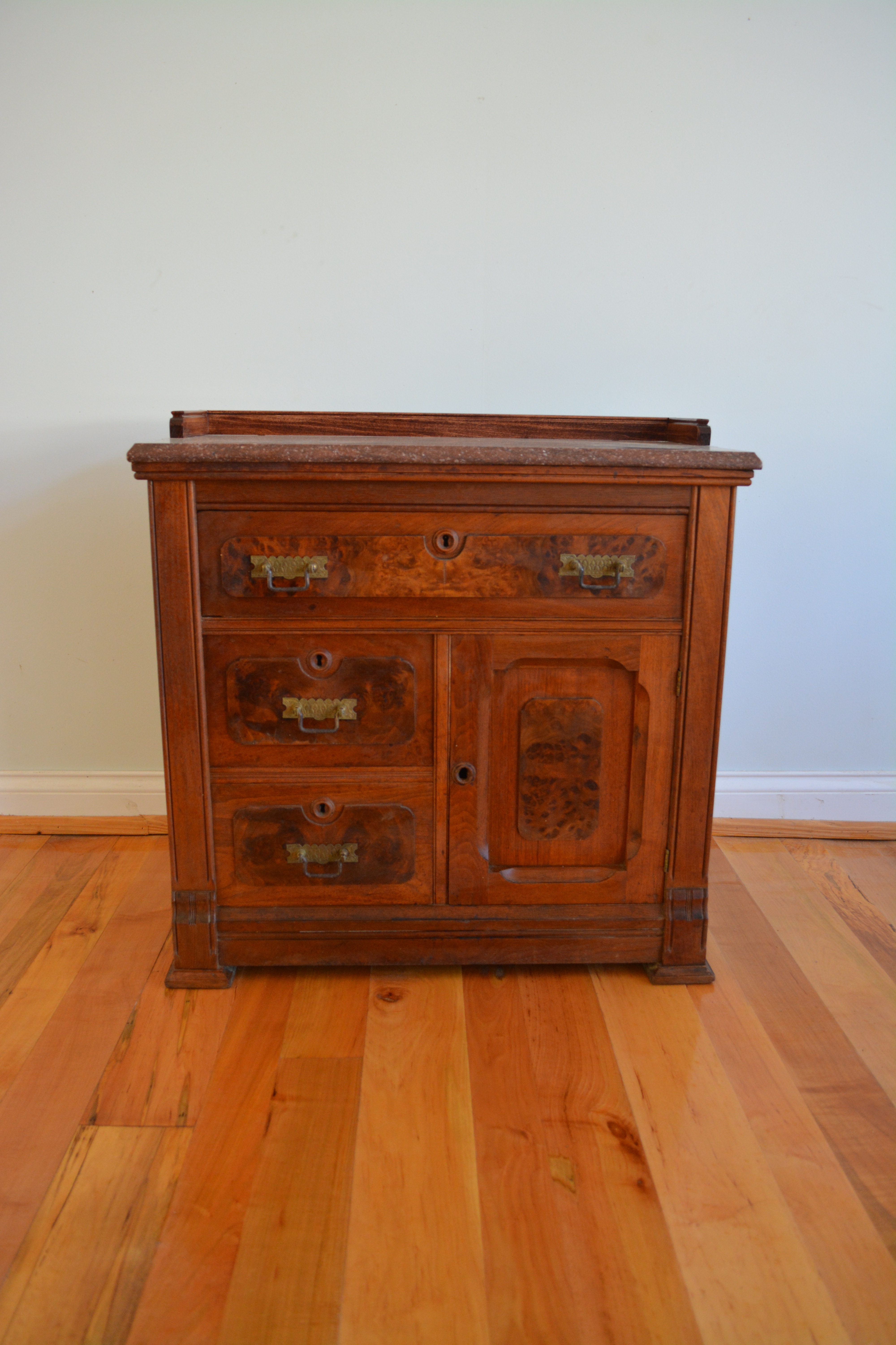 Antique chestnut drysink with marble top. This drysink is in great shape, faced with burled chestnut and features the rare and unique knapp joint on the drawers.