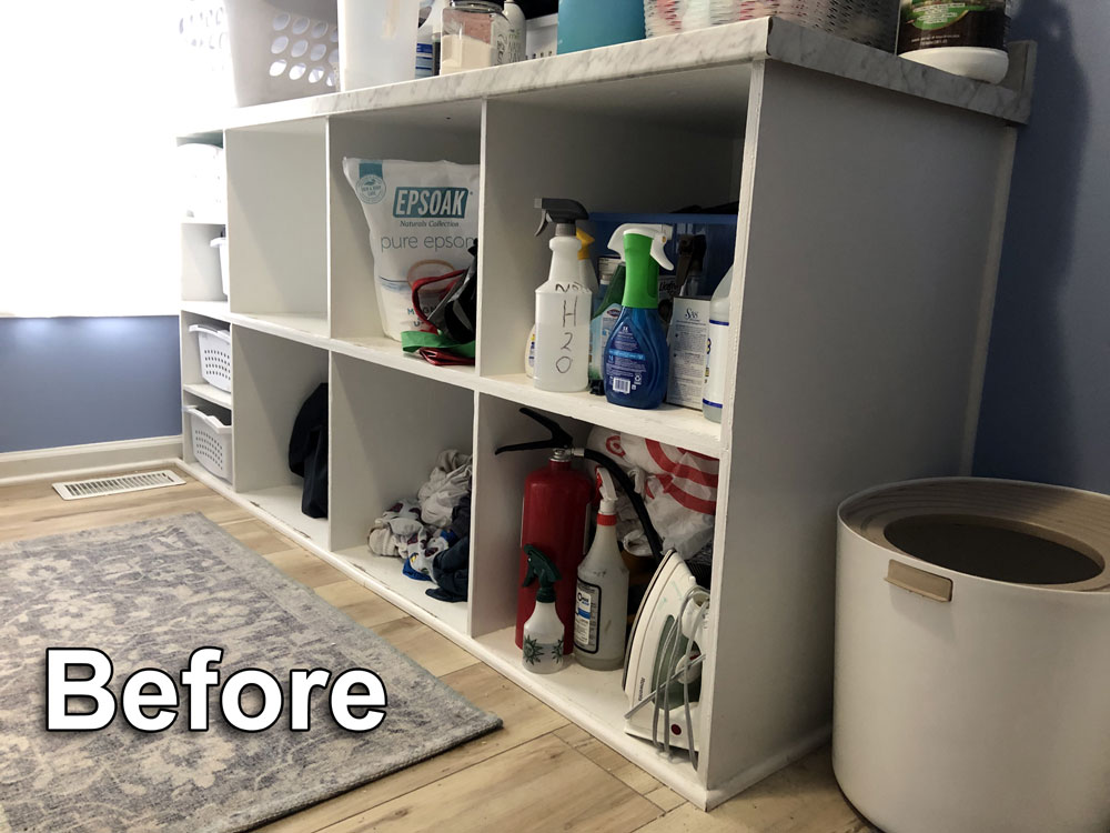 Custom made cabinet doors to conceal the contents of the laundry cubbies. Painted white and finished off with nickel hardware.