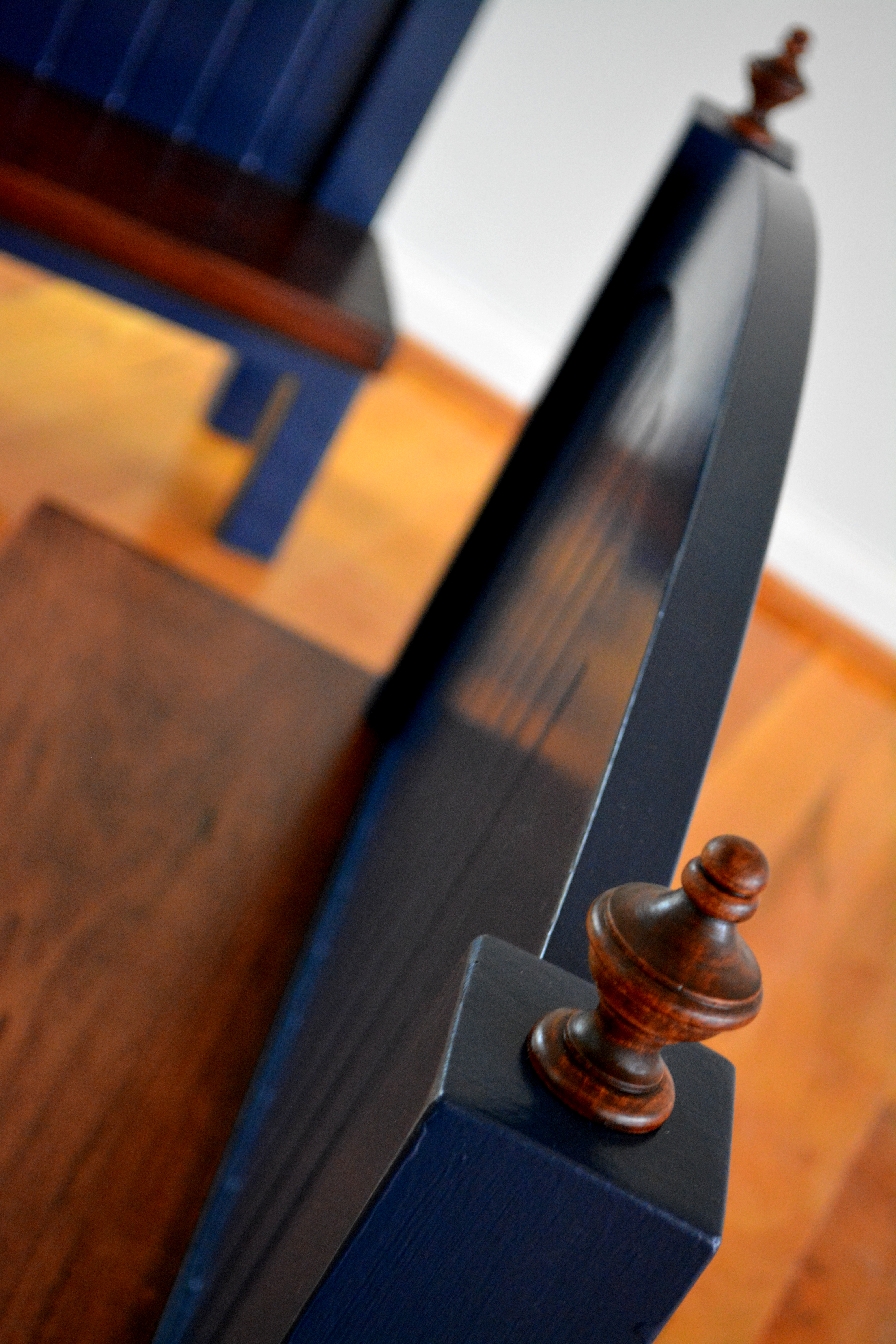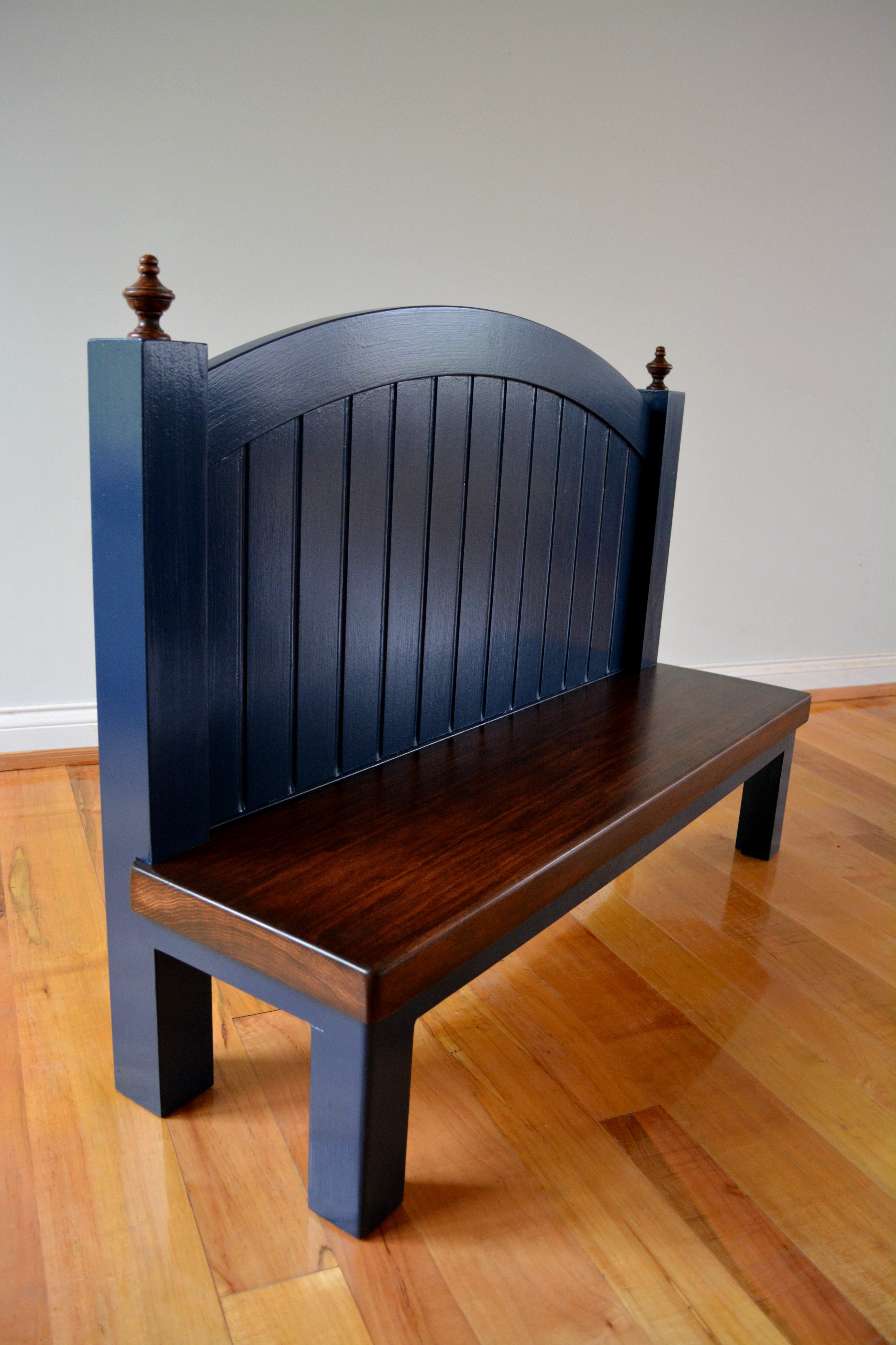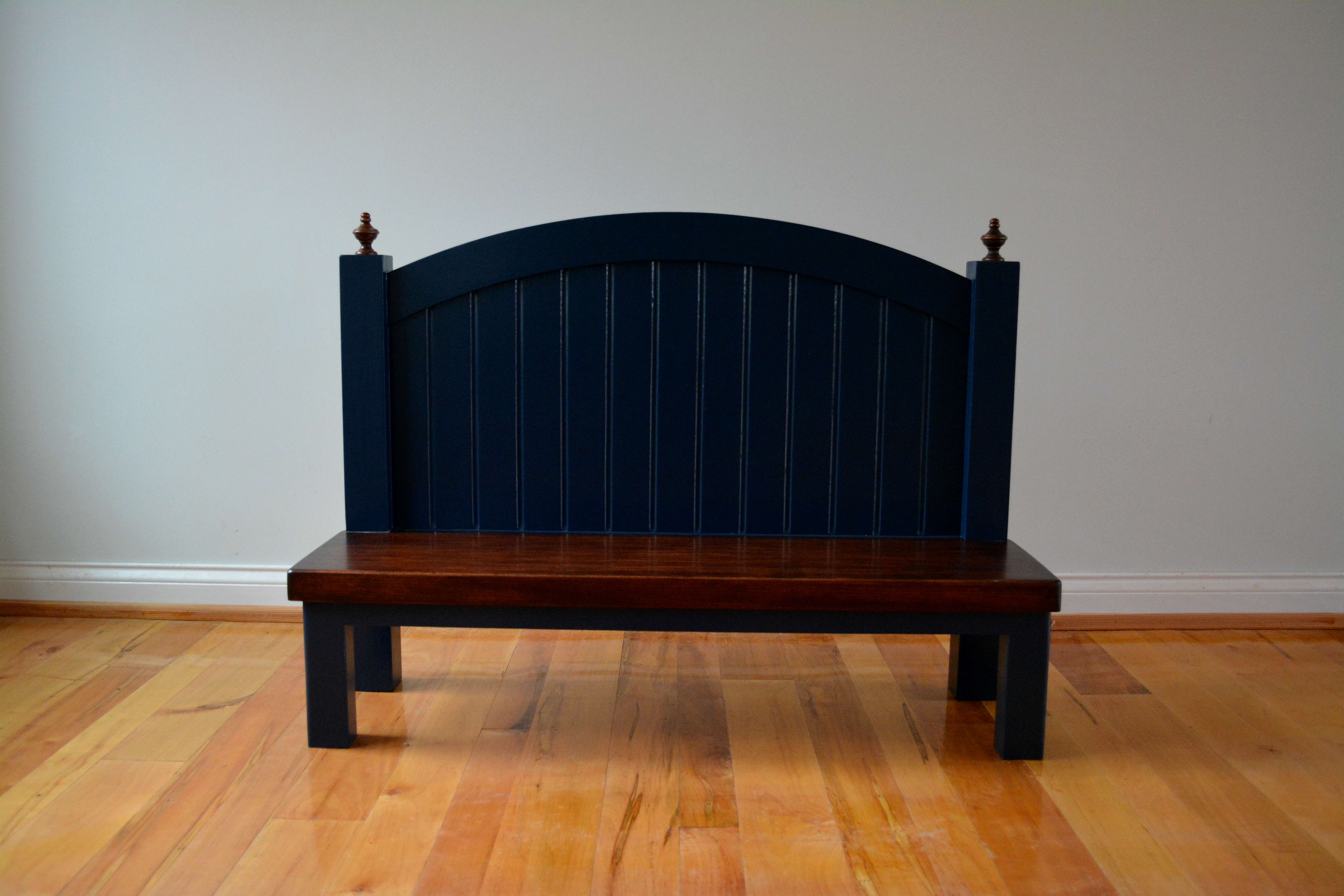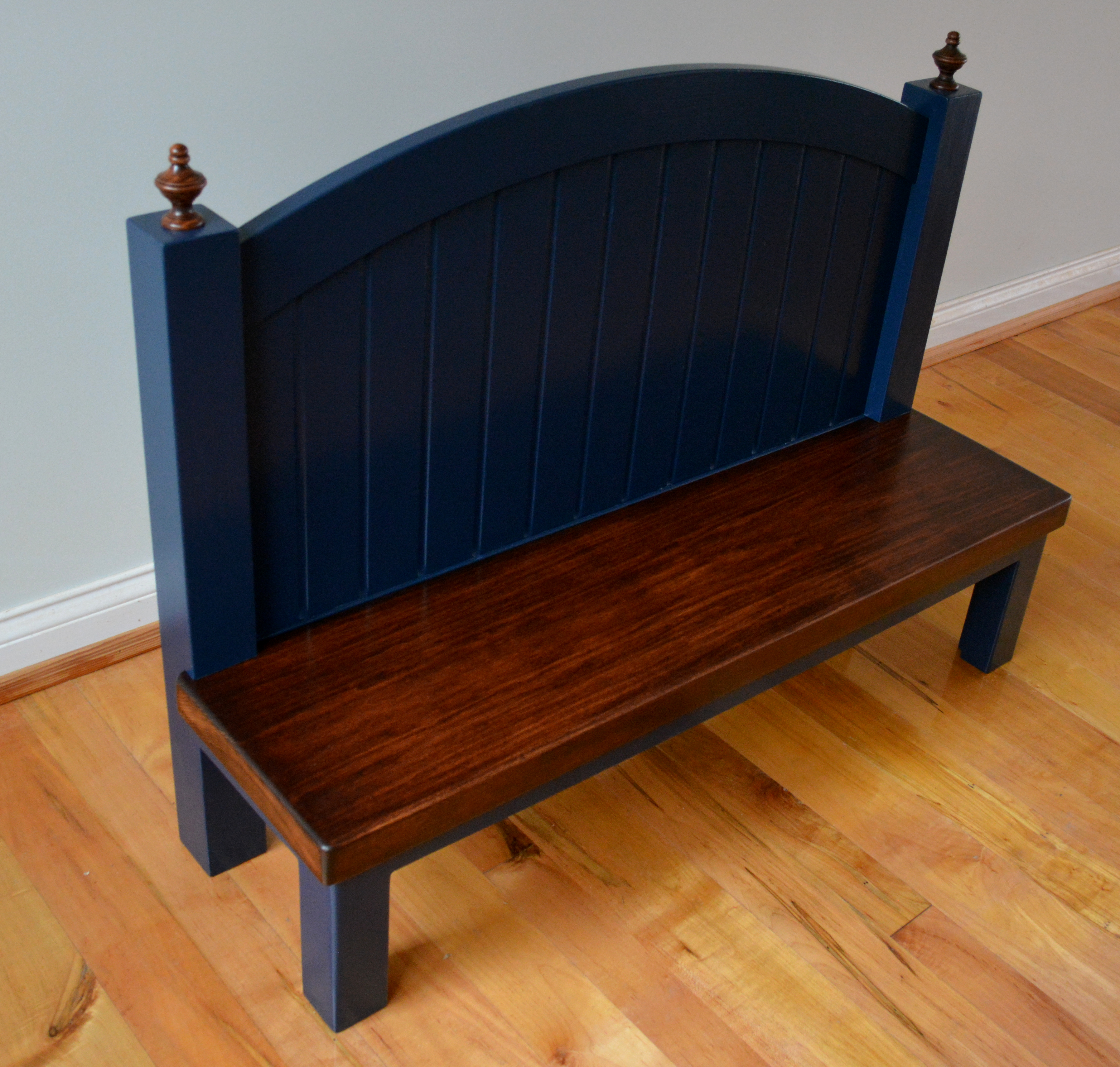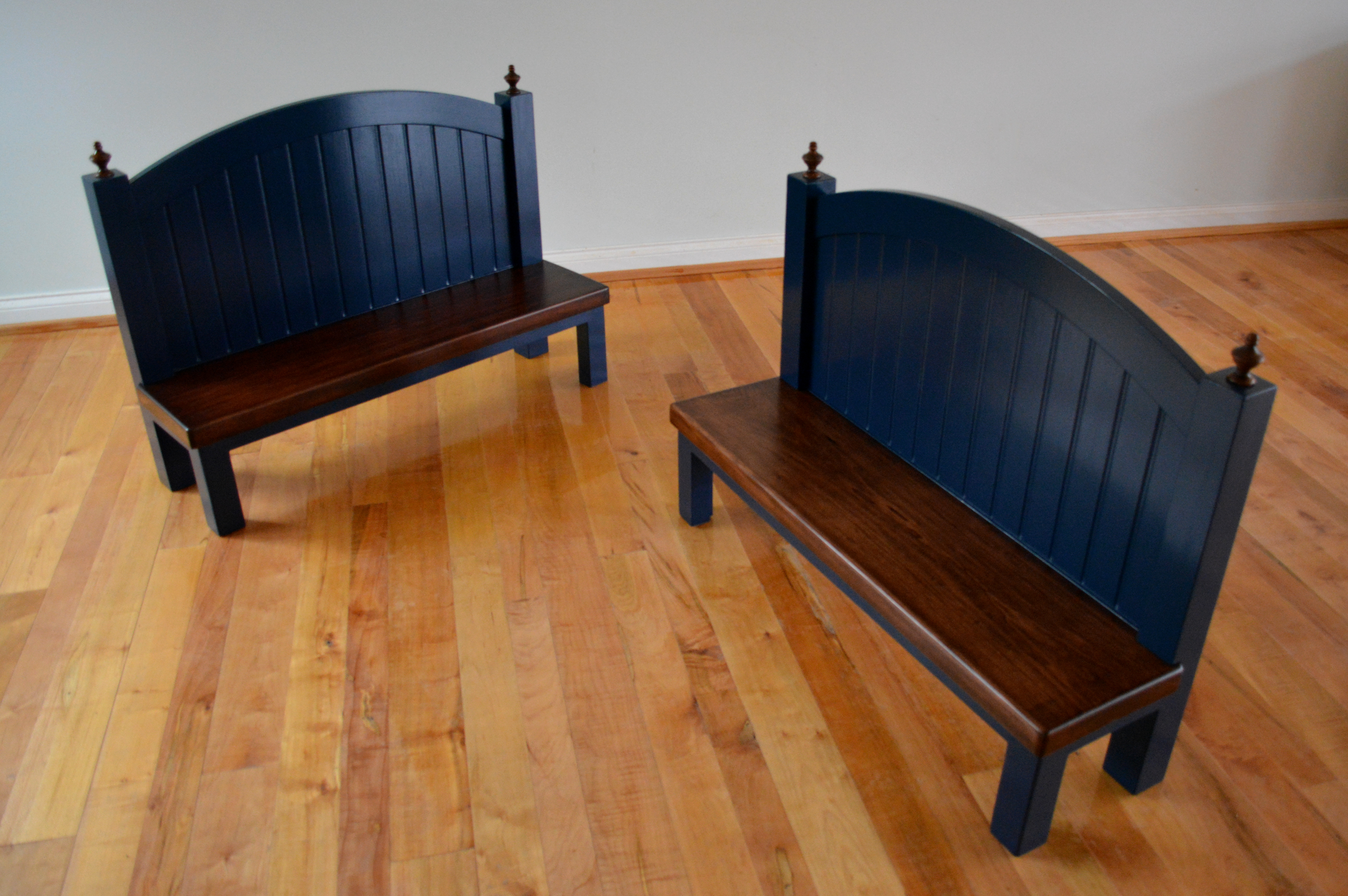 New handmade maple benches designed for children. Featuring maple seats, decorative finials and backrests in Starless Night Blue.