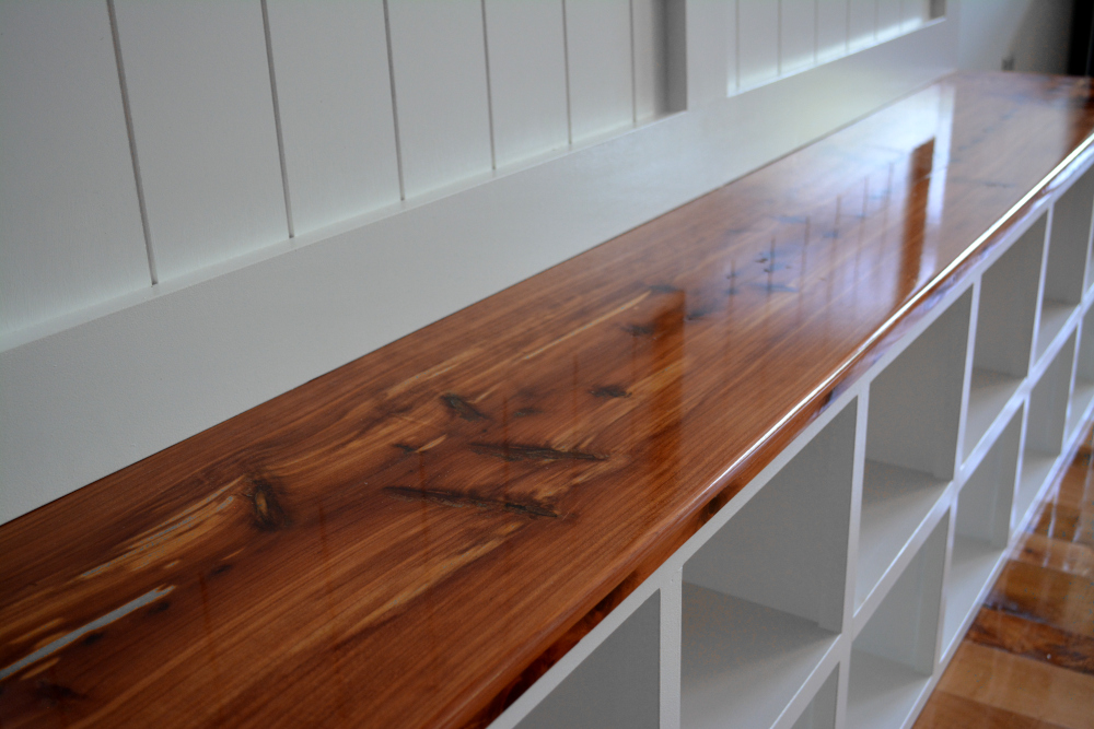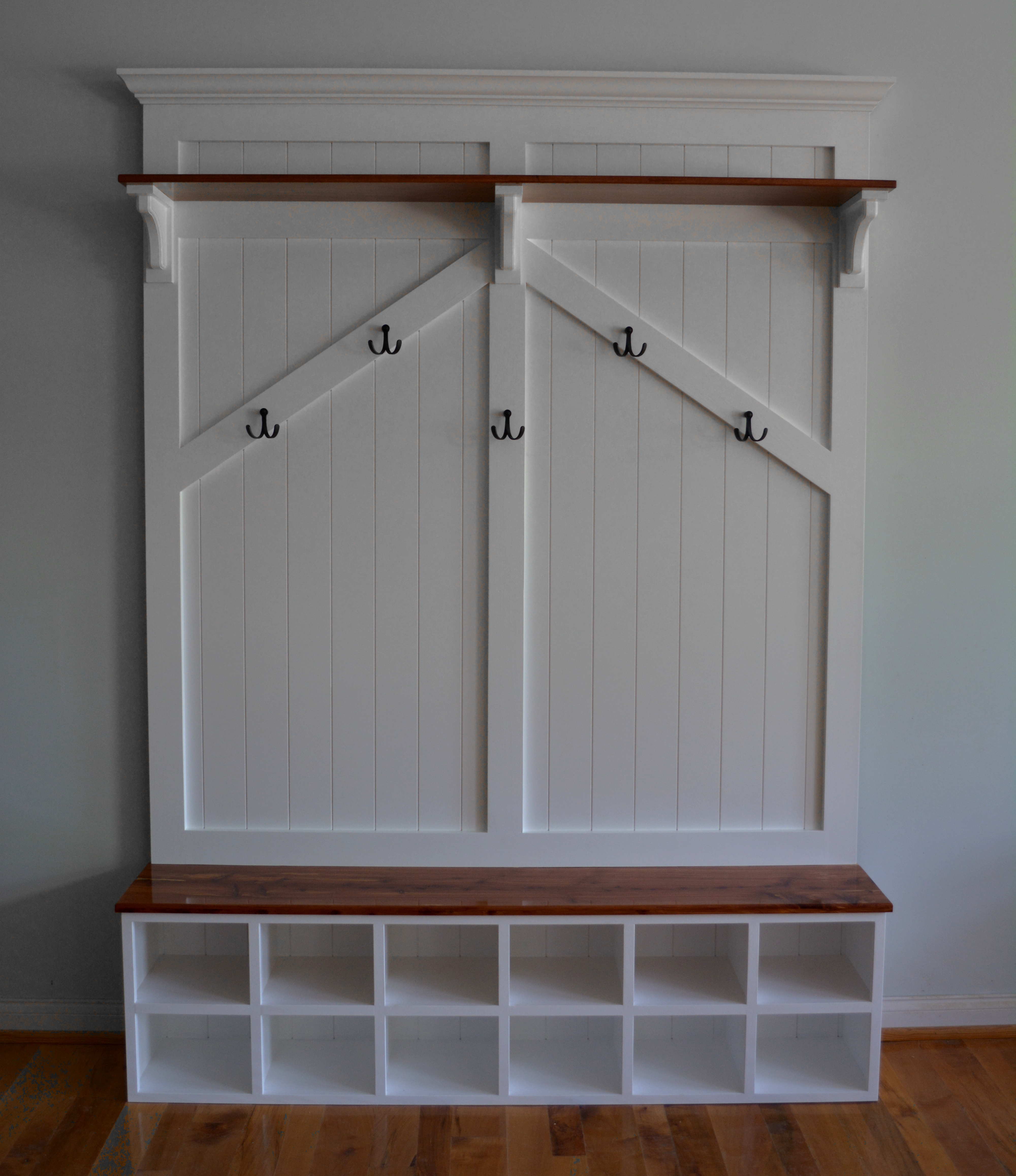 Custom made hall tree for client's pool area. Featuring a solid cedar bench top, hooks for wet towels, a shelf for dry towels and cubies for shoes and flip flops.