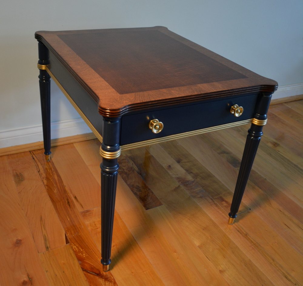 Materials: Maple & Tiger Cherry Dimensions: 22"H x 22"W x 27"D Description: Vintage Henredon side table with maple and tiger cherry top, starless night blue base and gold accents. Well made with dove tail drawers and decorative brass pulls and sabots.