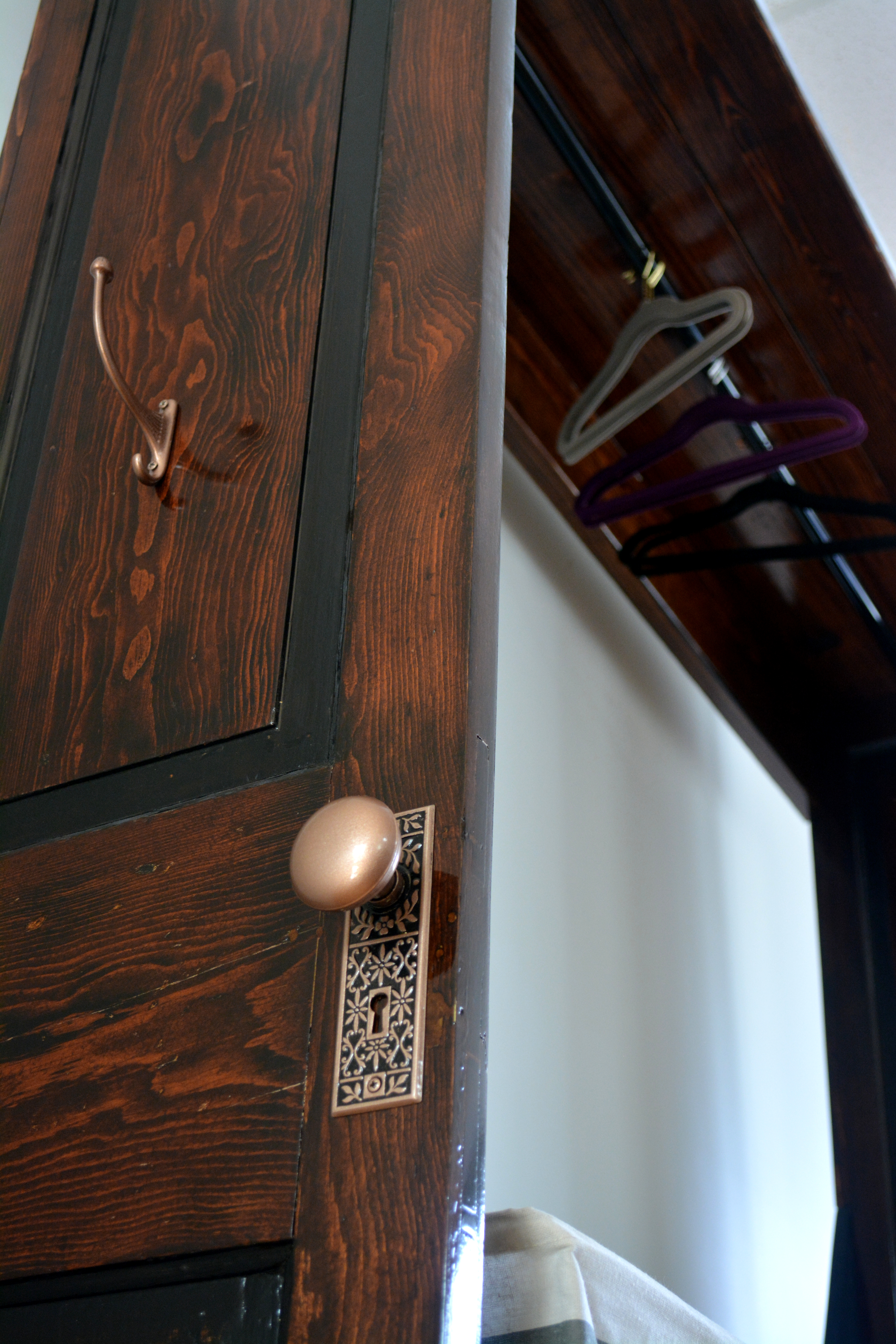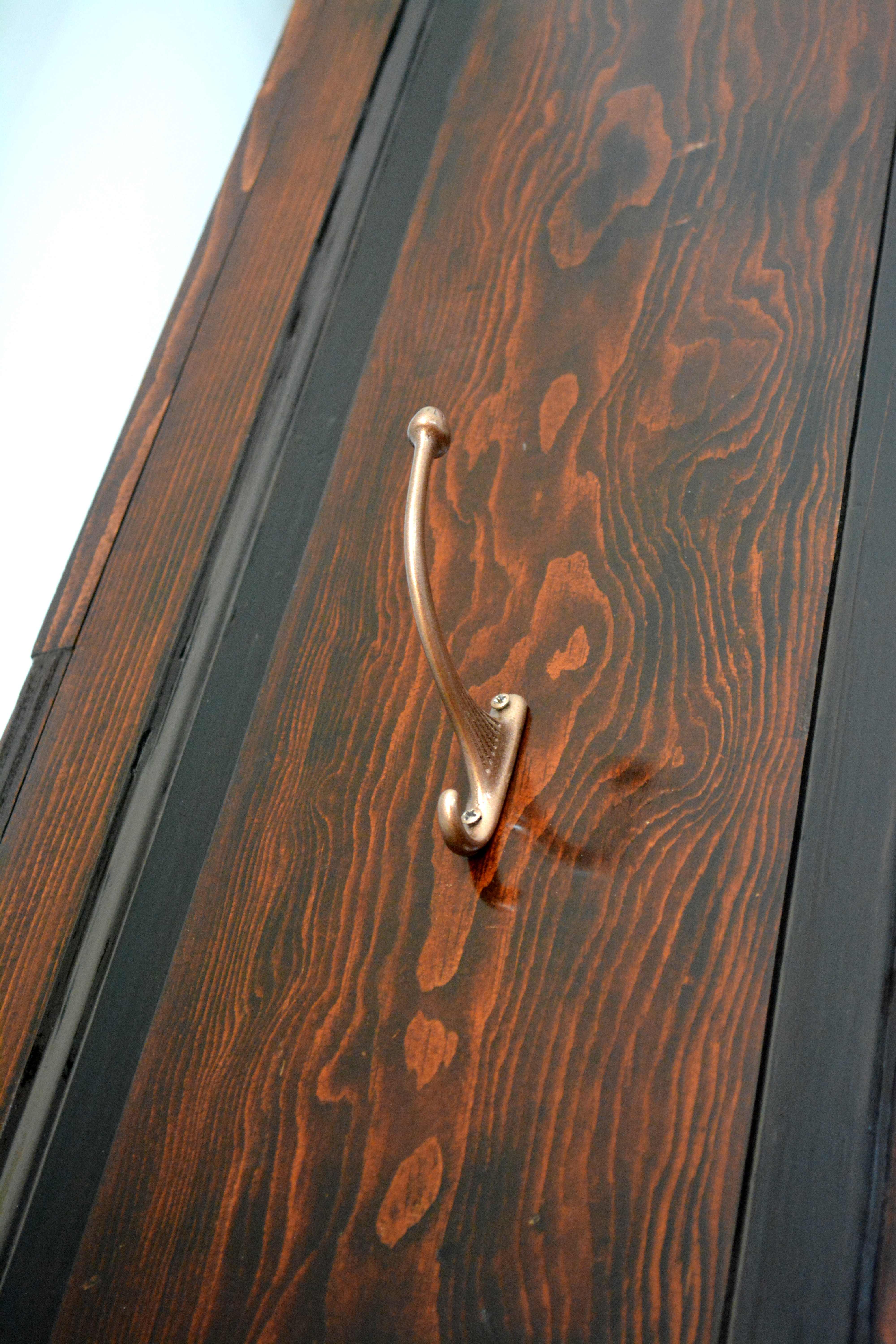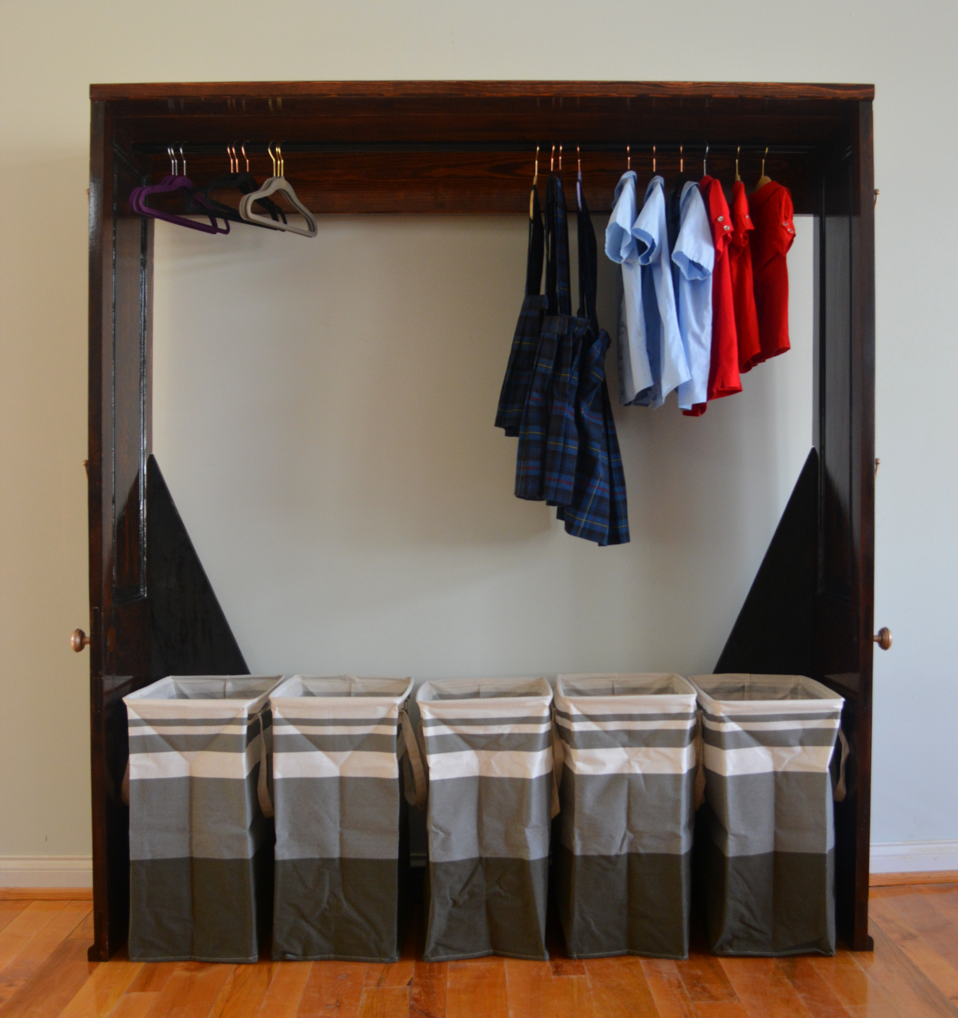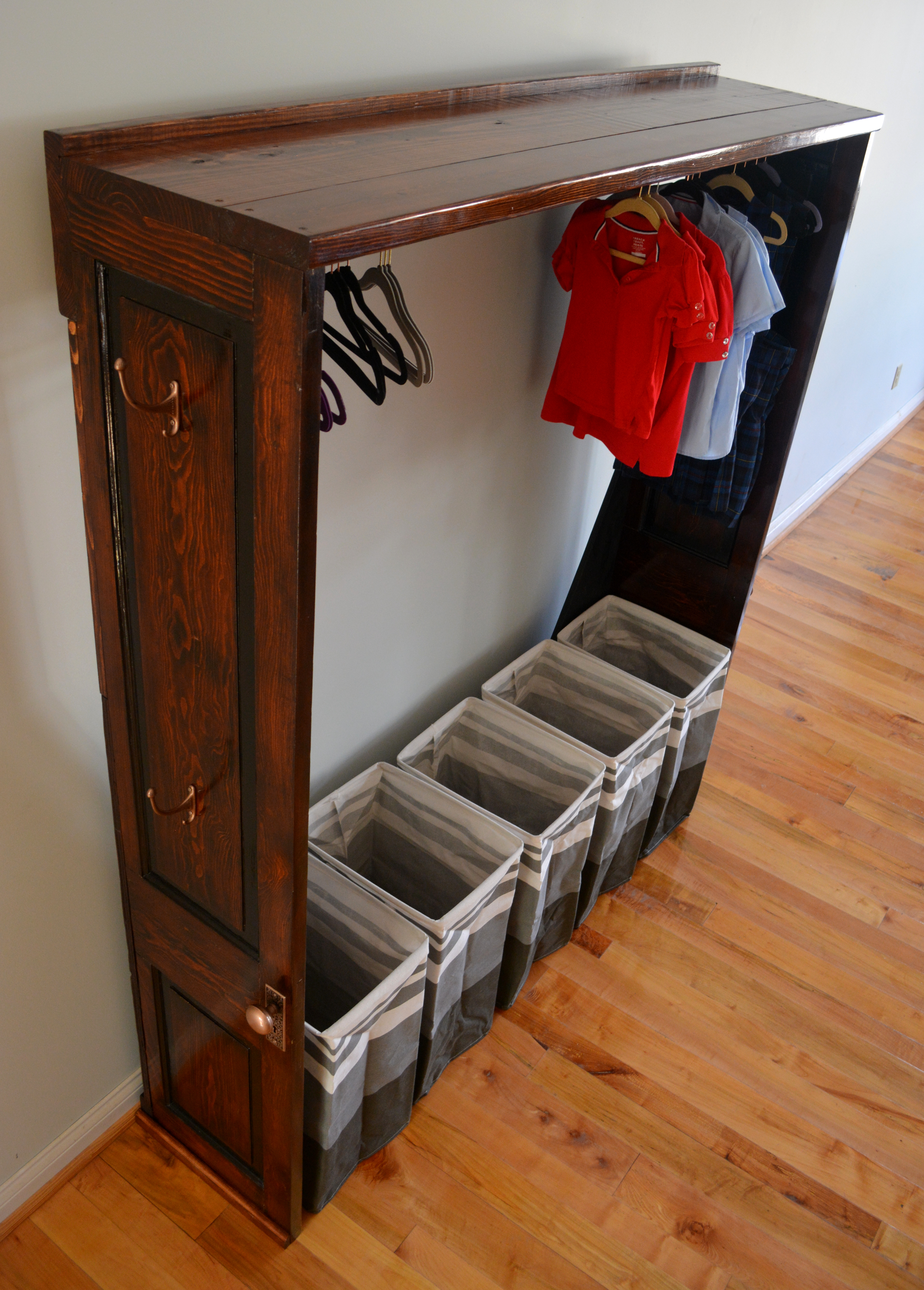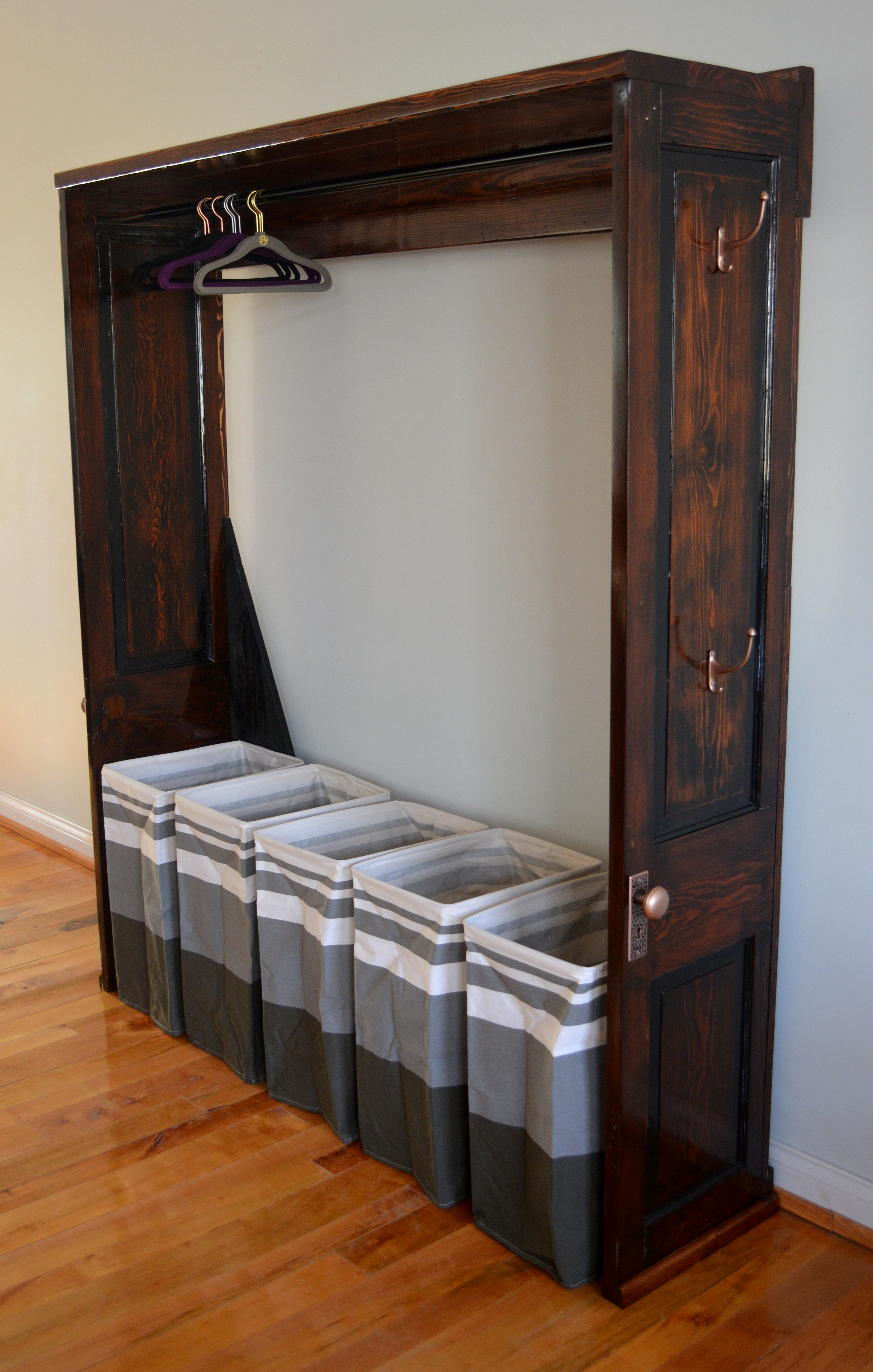 Materials: Fir Dimensions: 70"W x 80"H x 16"D Description: Freestanding laundry organizer made from 100 plus year old doors. Offering room for five laundry sacks, sixty eight inches of clothes rod and a copious amount of shelving space. The unit is finished off with a woodgrain enhancing stain technique, high gloss polyurethane and antique hardware in rose gold, with four hooks and two knobs for hanging packpacks, purses and coats.