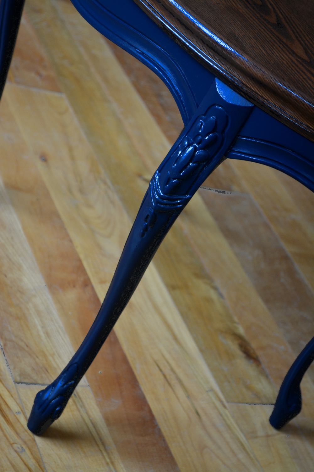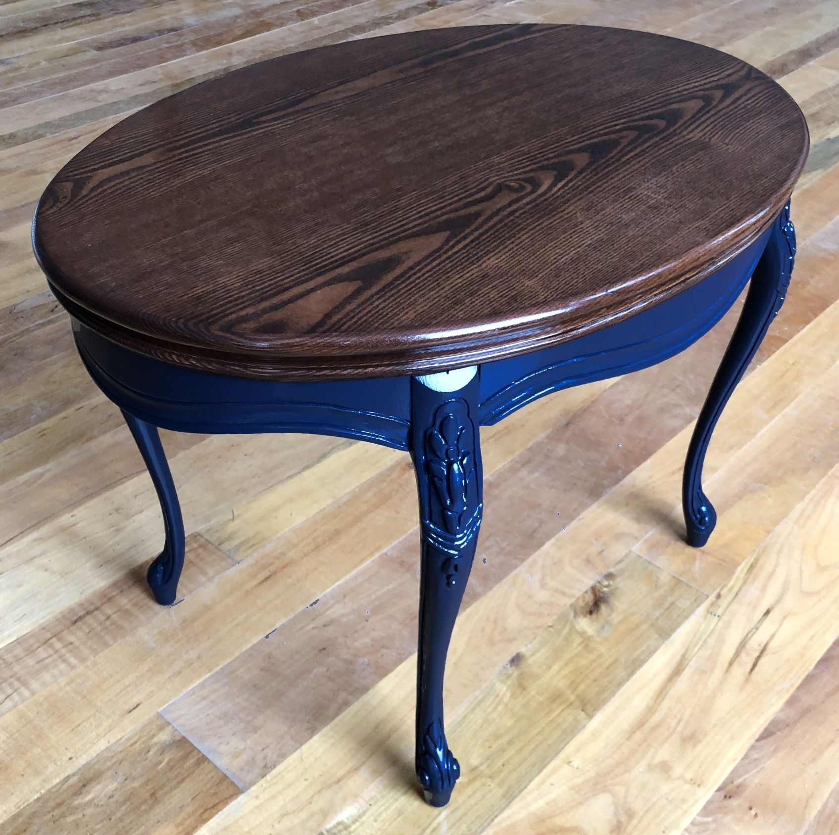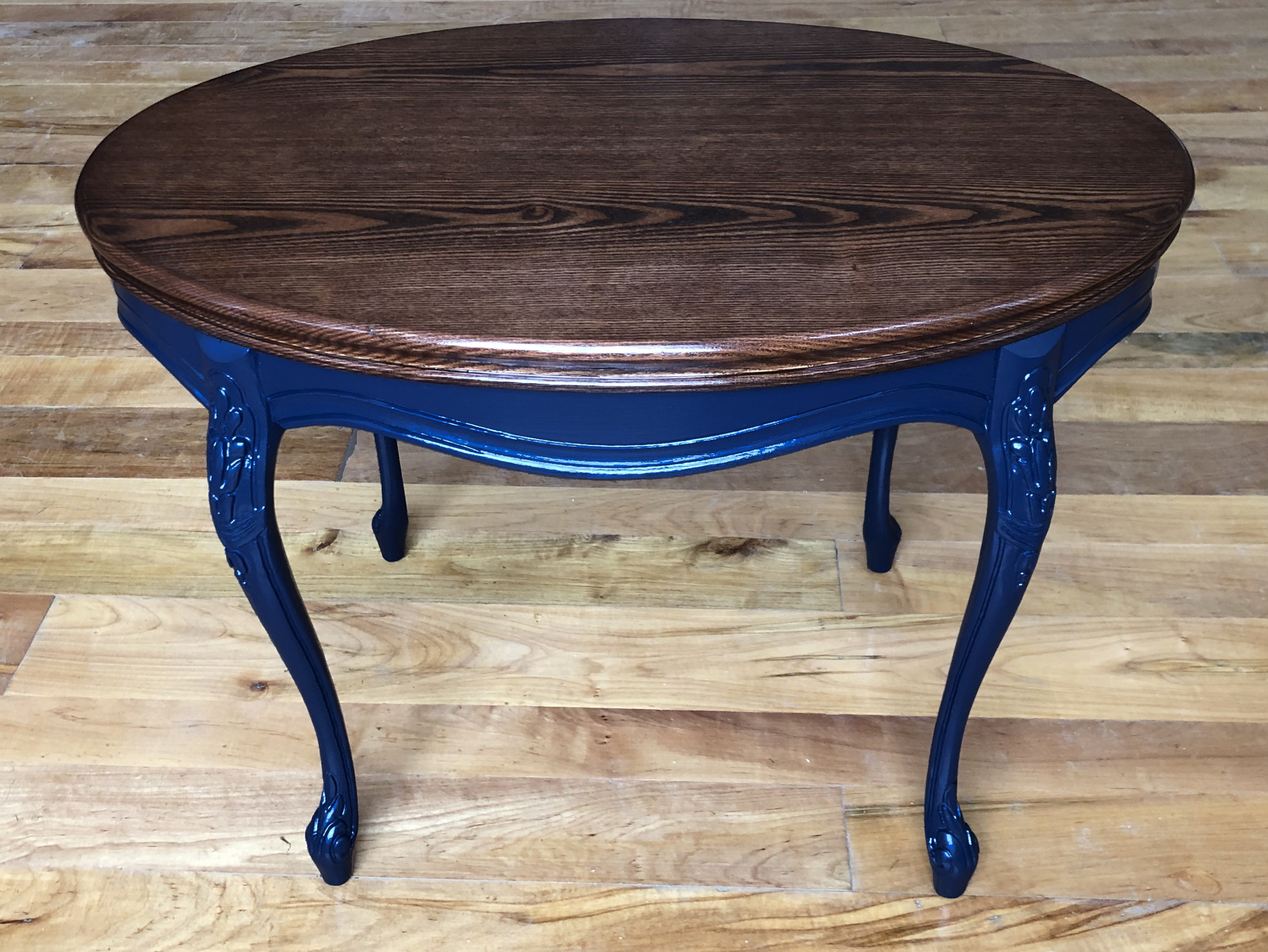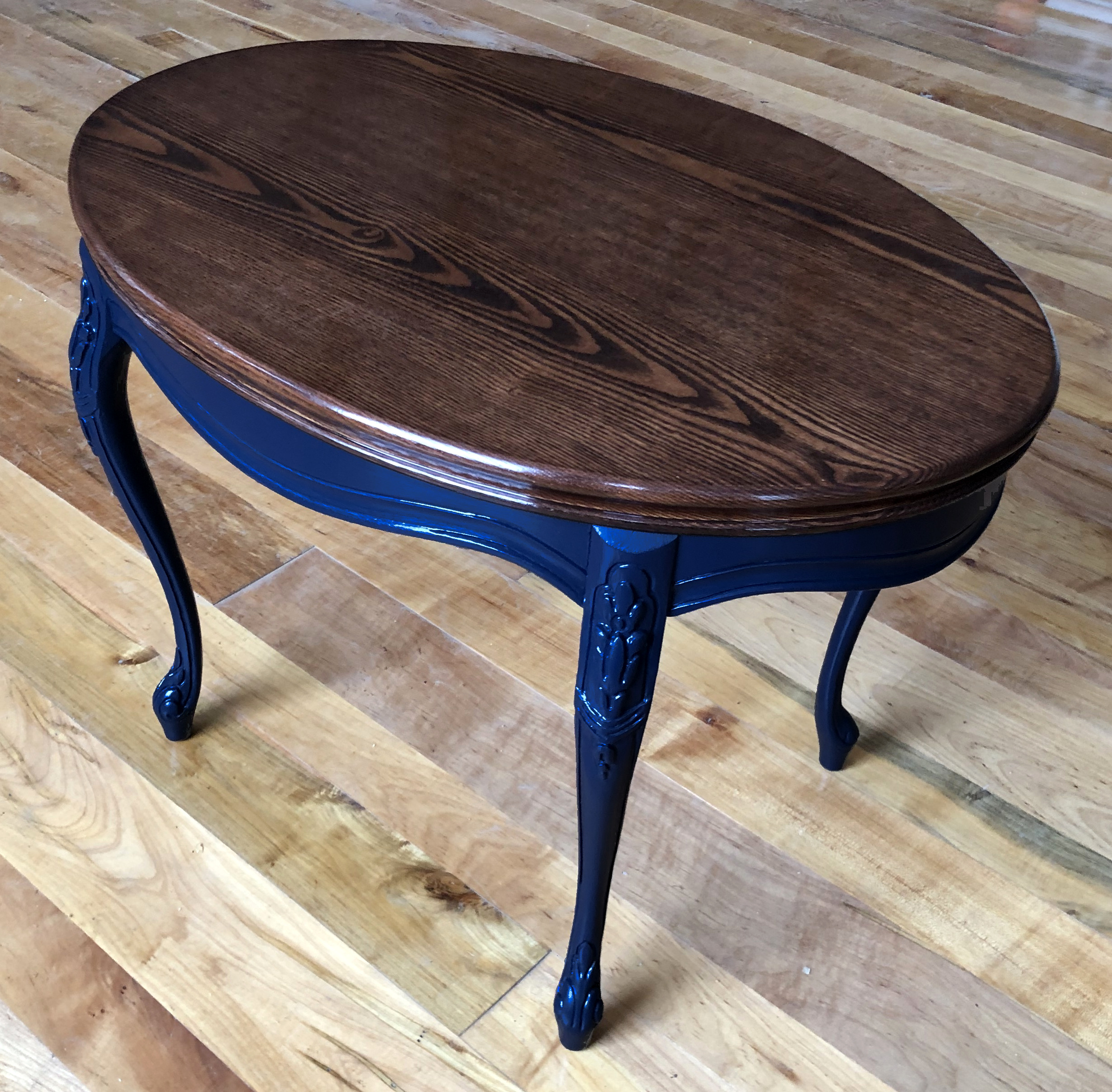 Oval coffee table with a top made from sassafras and hand carved legs in starless night blue.