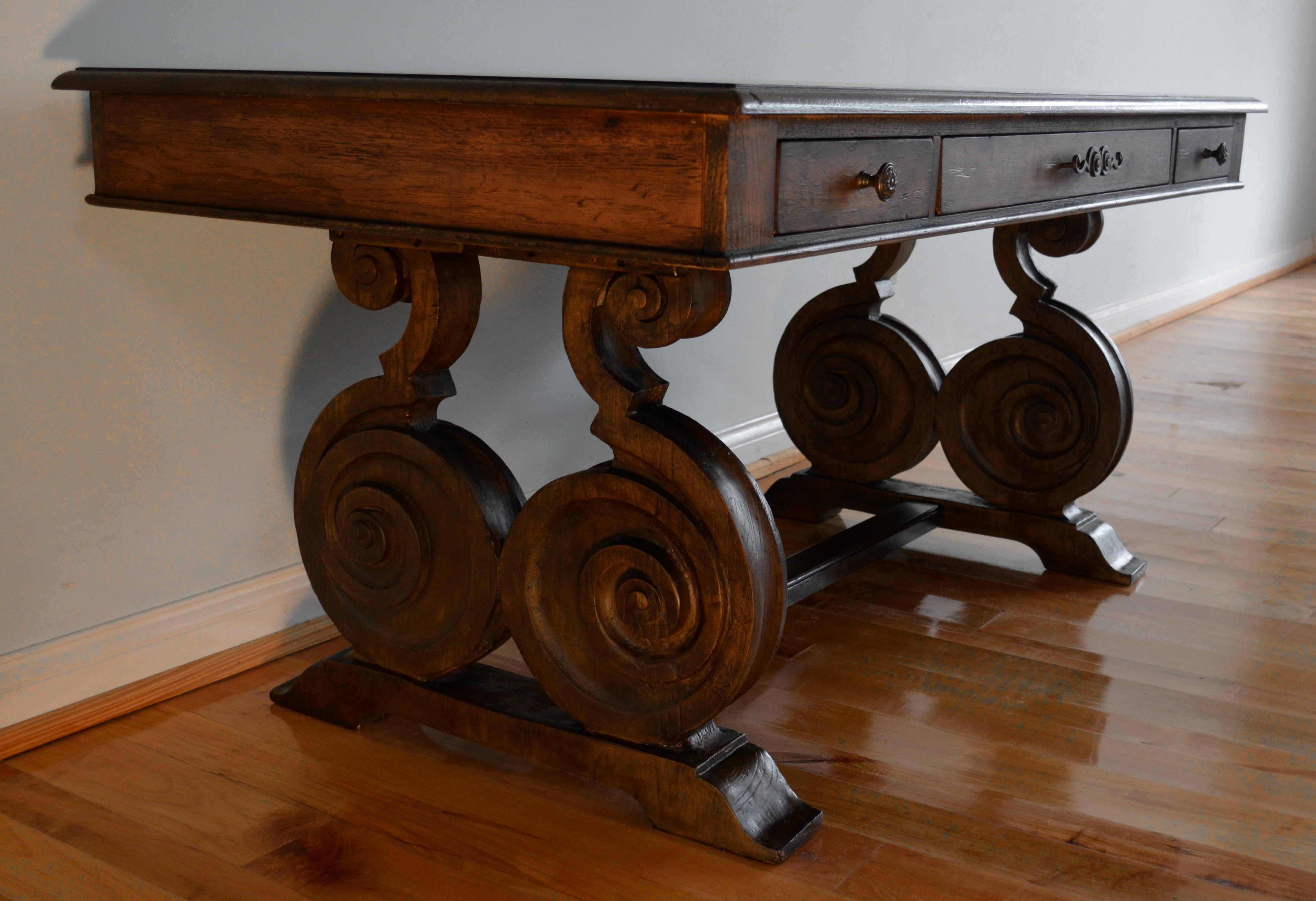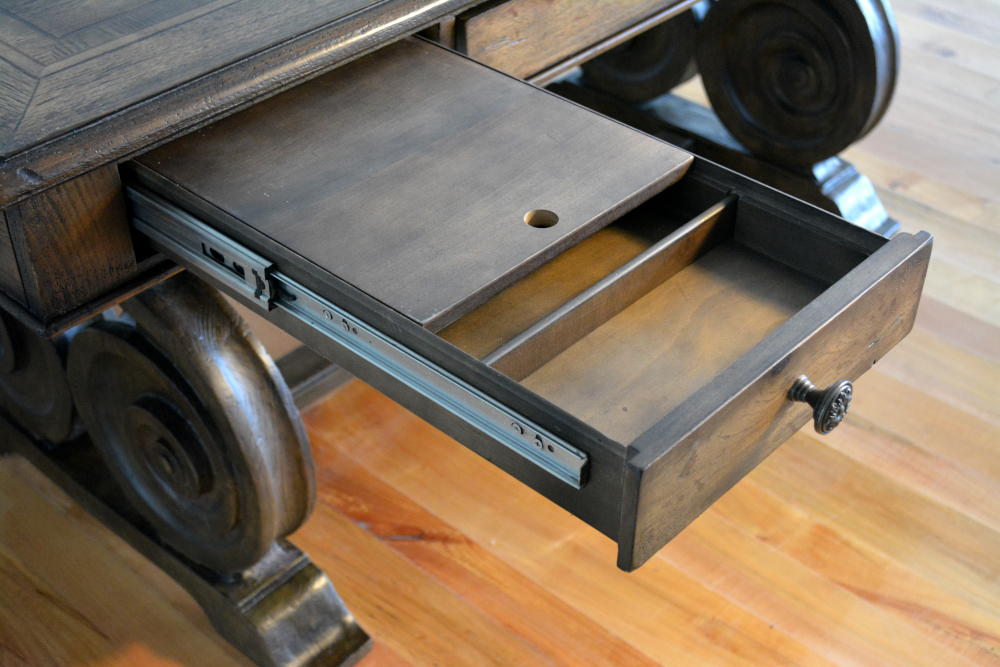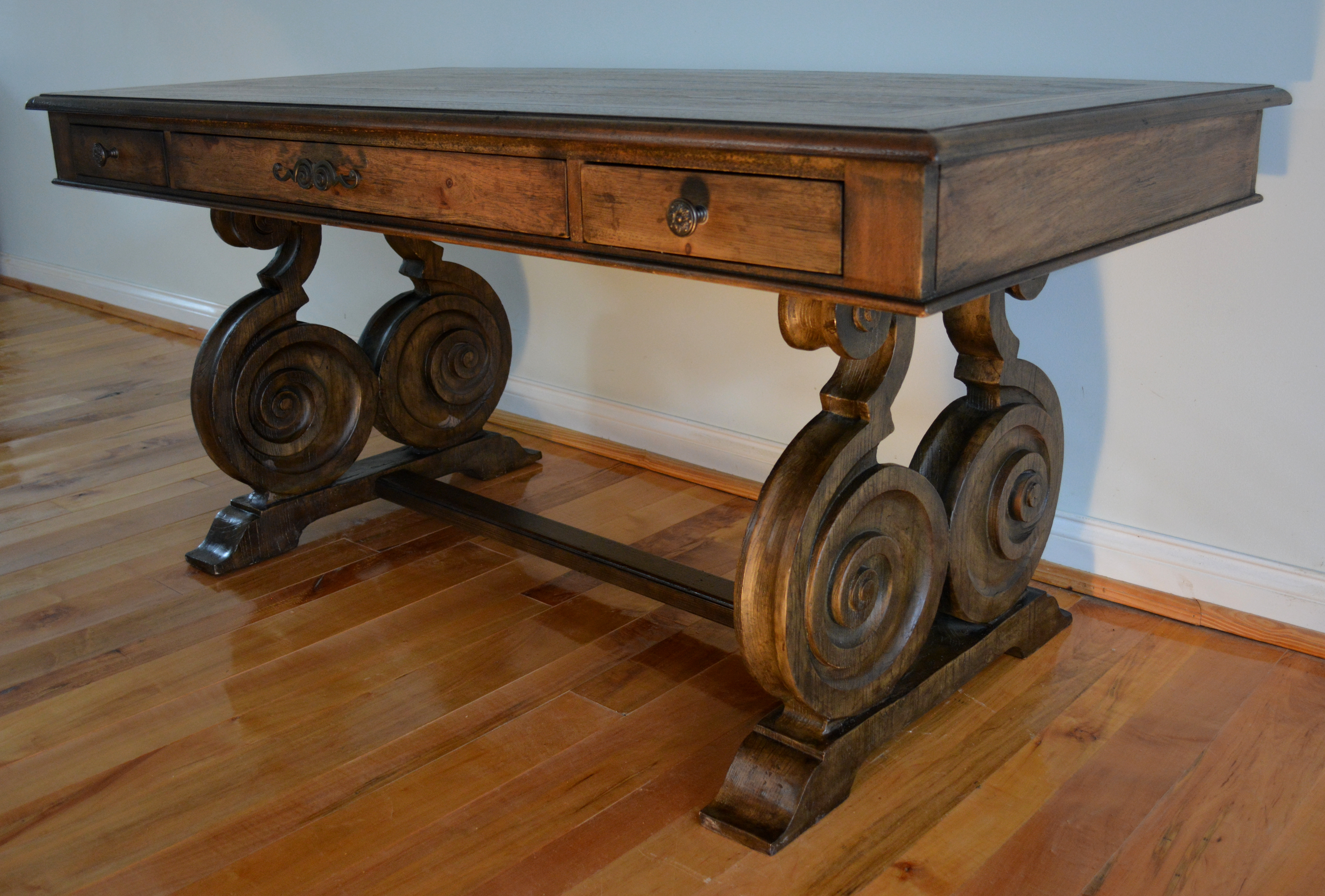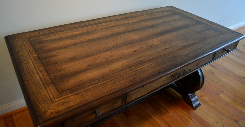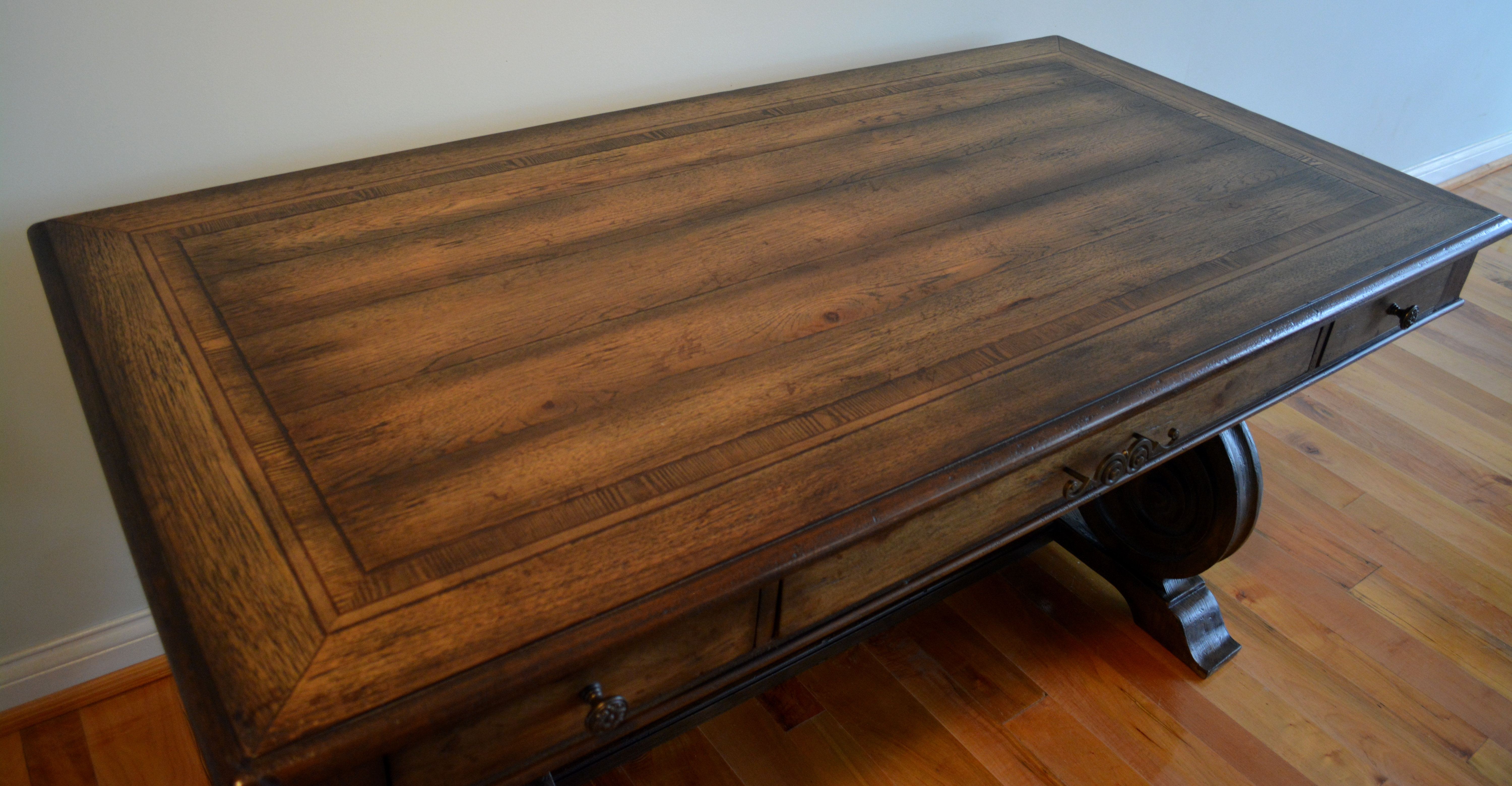 Materials: Pecan, Hickory, Ash, Walnut, Maple & Resin Dimensions: 30, 1/2"H x 66"L x 34"W Description: Rhapsody writing desk made with Pecan, Hickory, Ash, Black Walnut and Maple veneers. Offering a center drawer with drop-front for keyboard use, two drawers with one removable writing insert for use in either drawer, and 3 slots with 2 removable dividers in each drawer. This natural yet rustic piece would also make a very impressive dinning table.