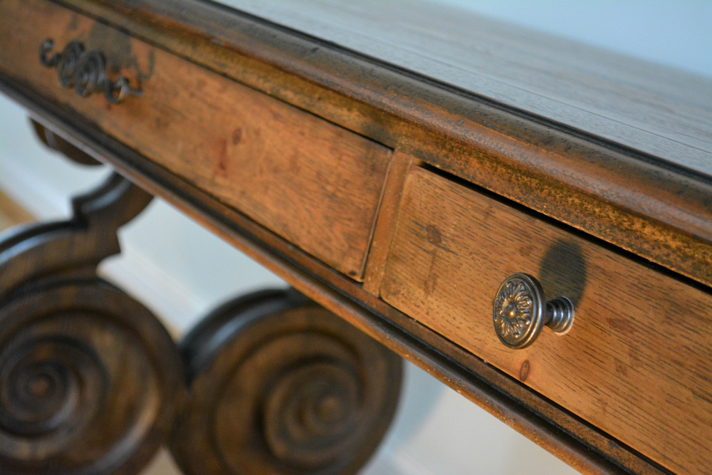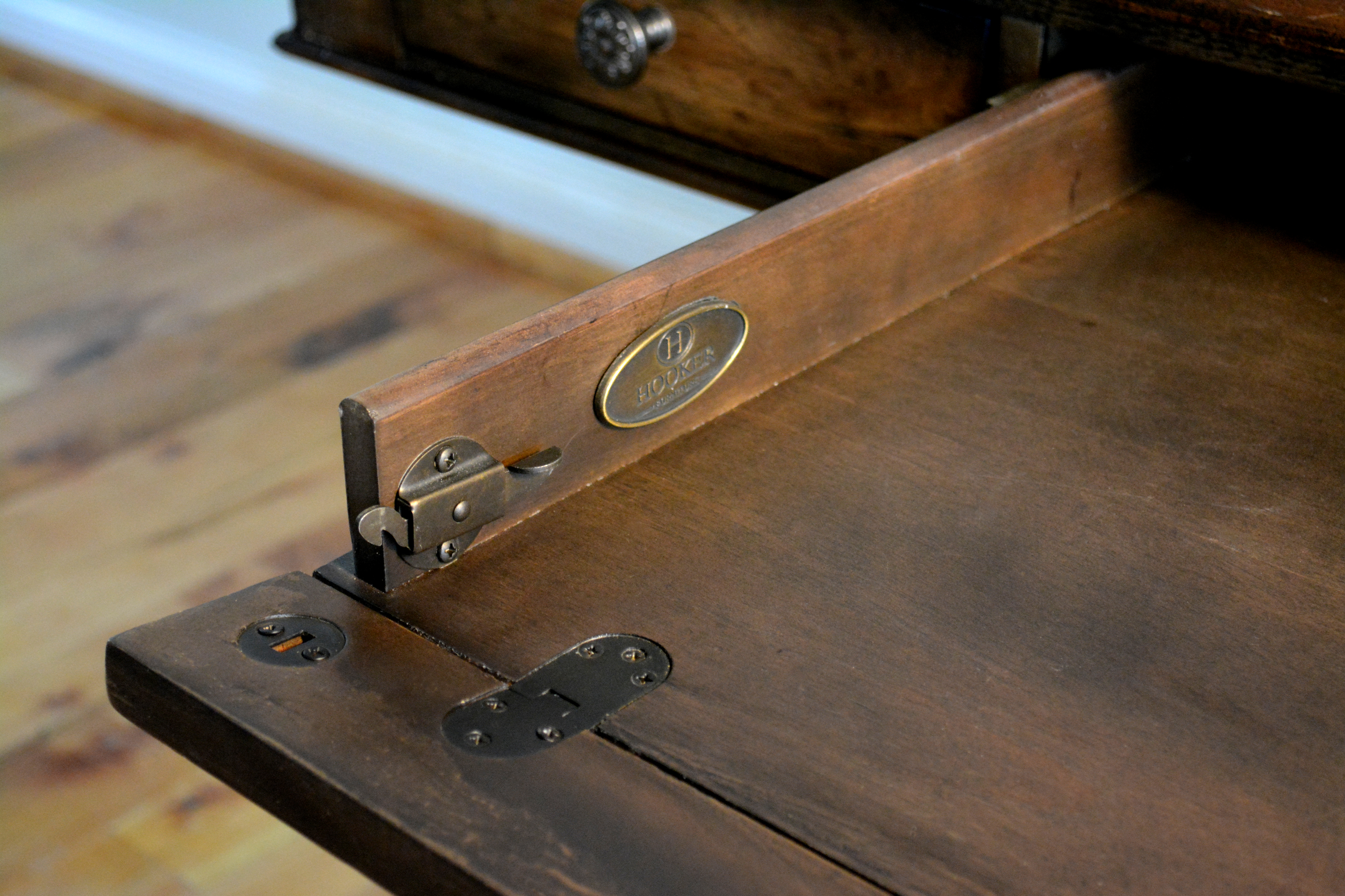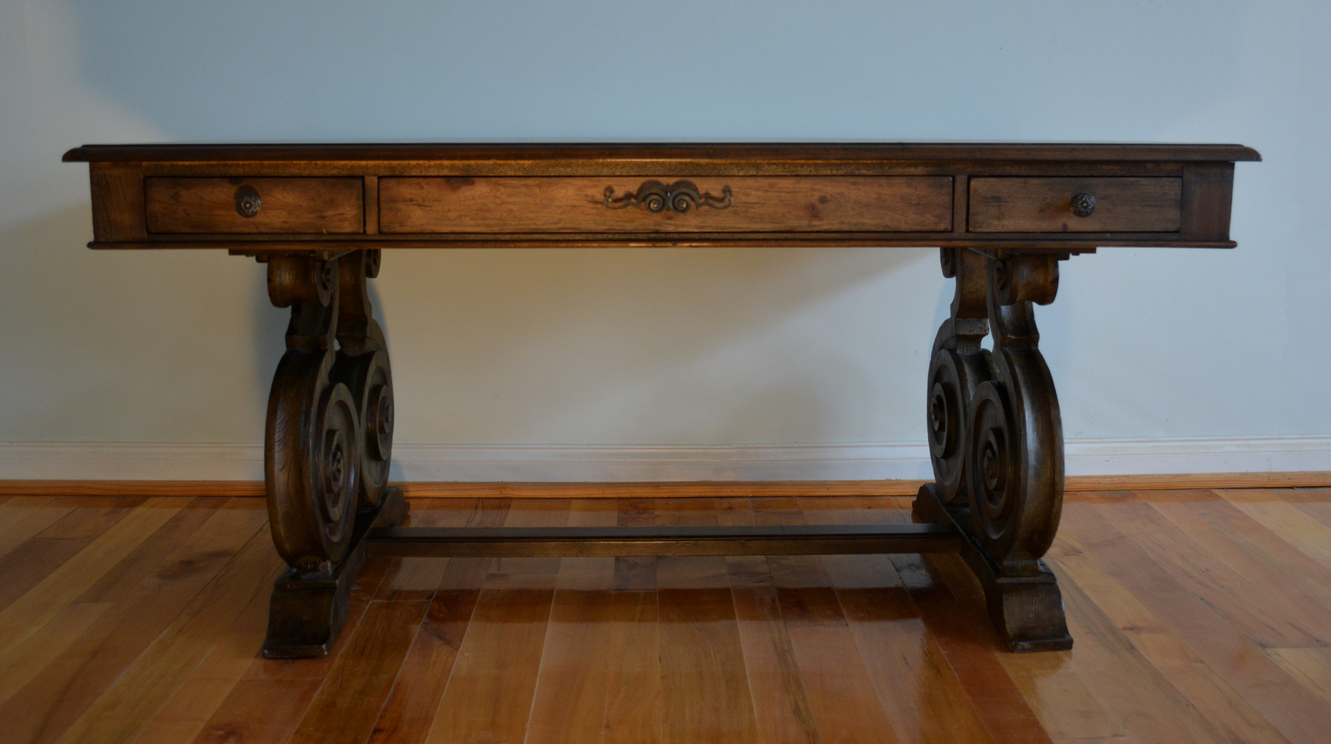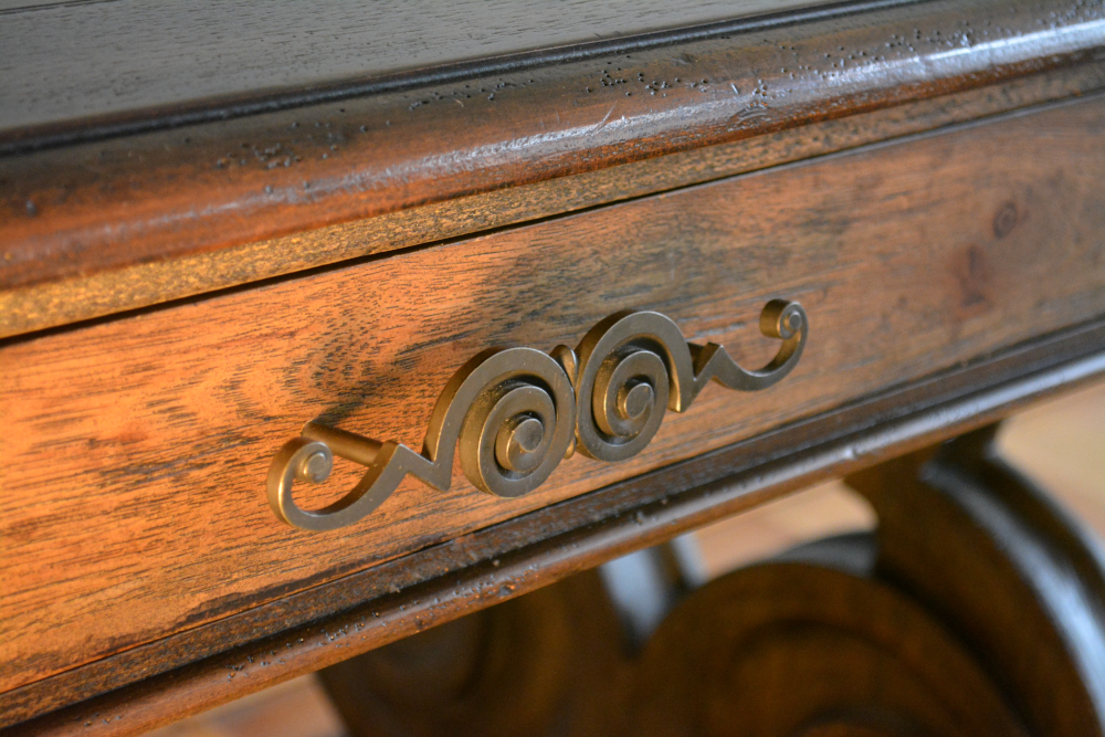 Materials: Pecan, Hickory, Ash, Walnut, Maple & Resin Dimensions: 30, 1/2"H x 66"L x 34"W Description: Rhapsody writing desk made with Pecan, Hickory, Ash, Black Walnut and Maple veneers. Offering a center drawer with drop-front for keyboard use, two drawers with one removable writing insert for use in either drawer, and 3 slots with 2 removable dividers in each drawer. This natural yet rustic piece would also make a very impressive dinning table.