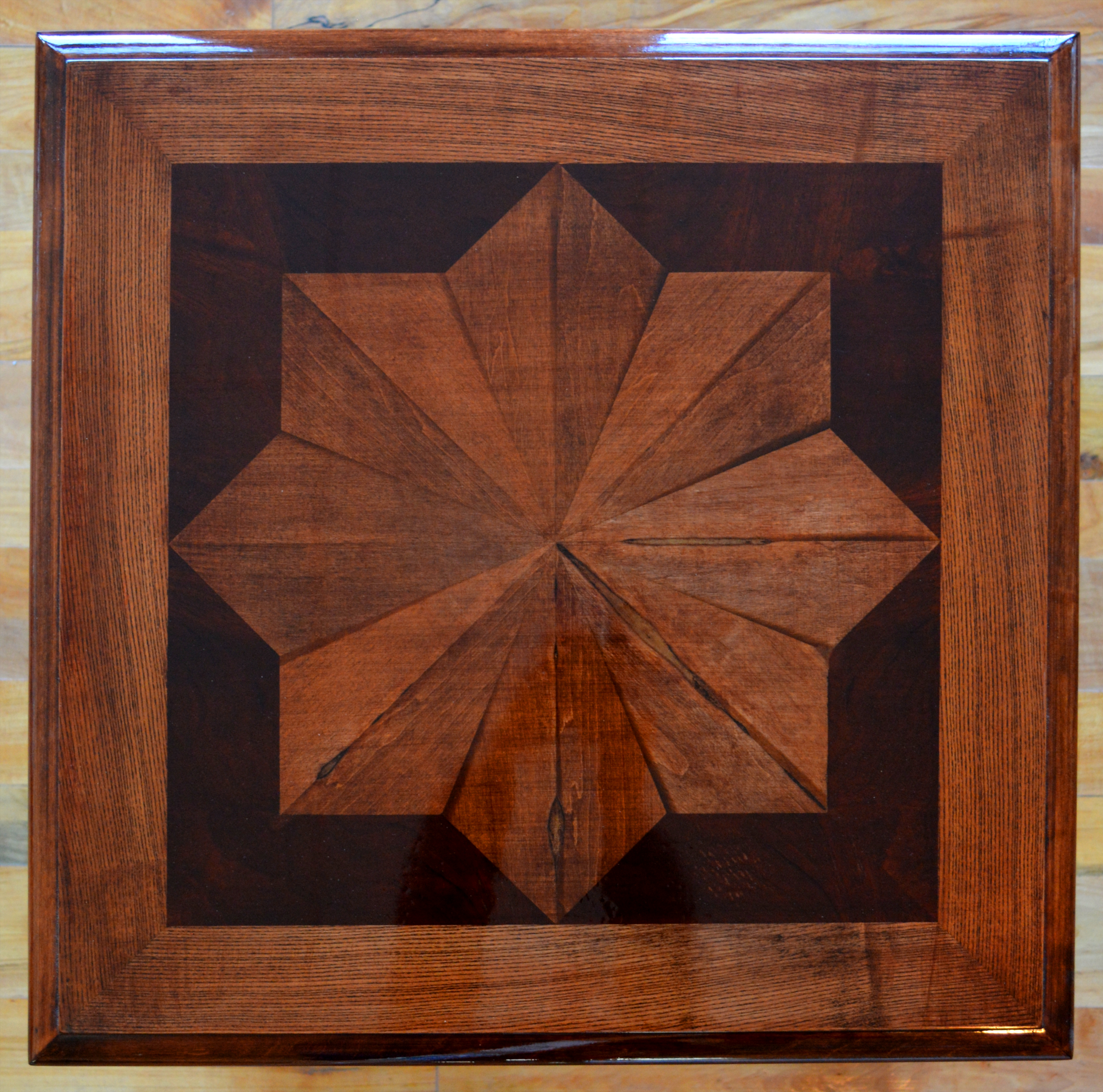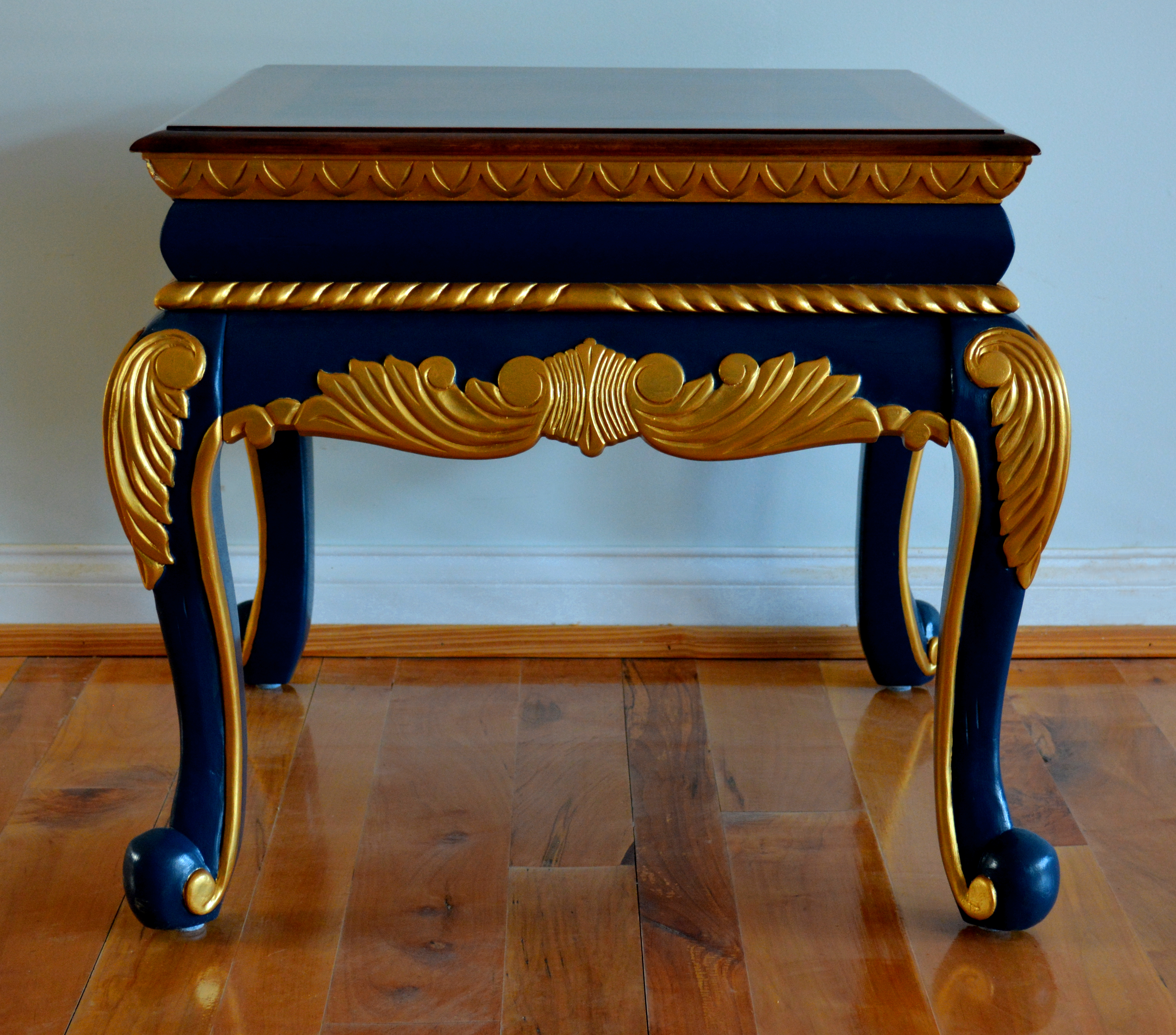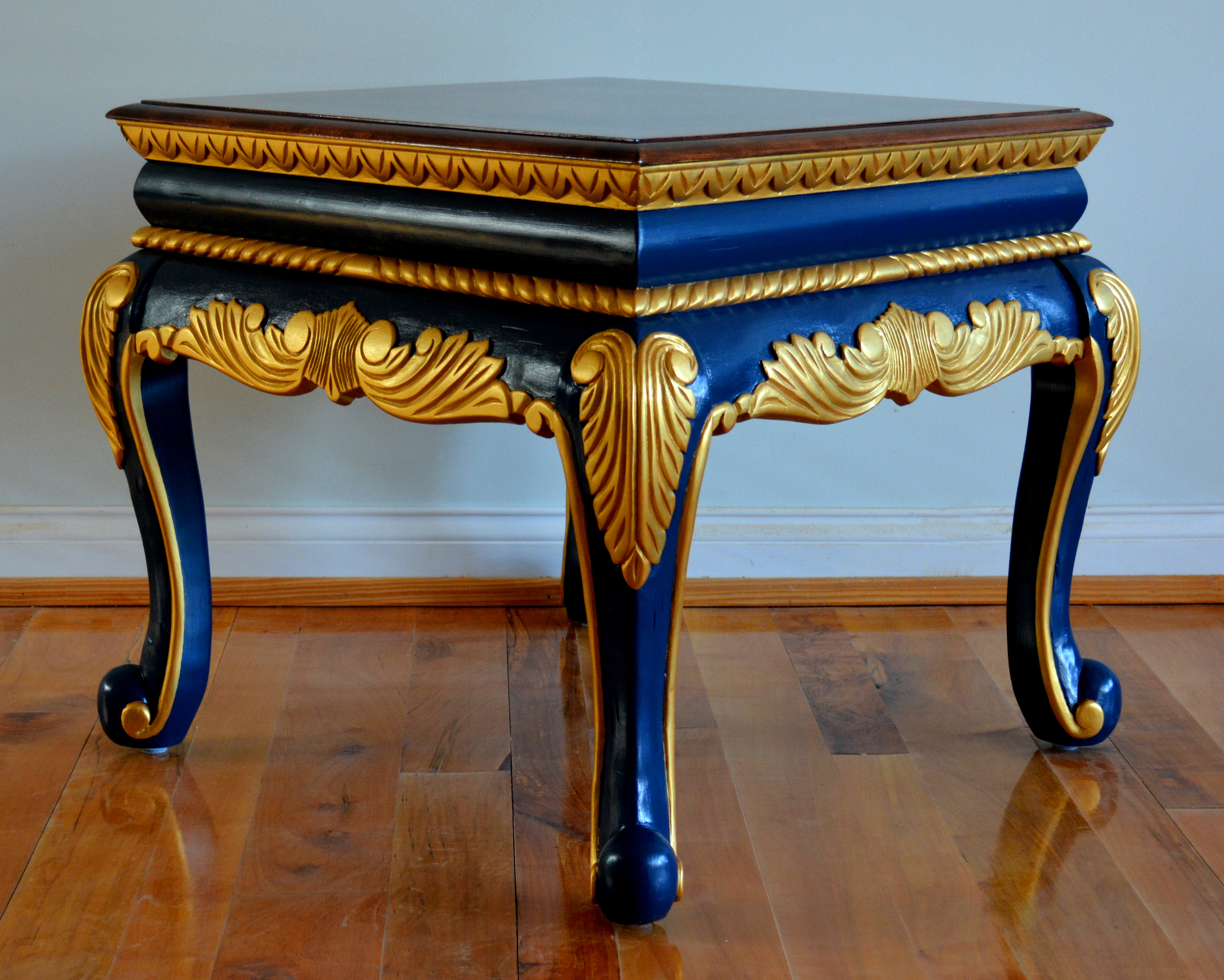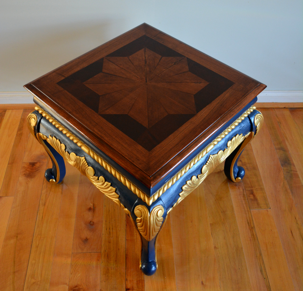 Ornate side table with a top featuring an inlaid star made from maple, walnut and cherry, resting on ornate scrolled legs in gold and starless night blue.
