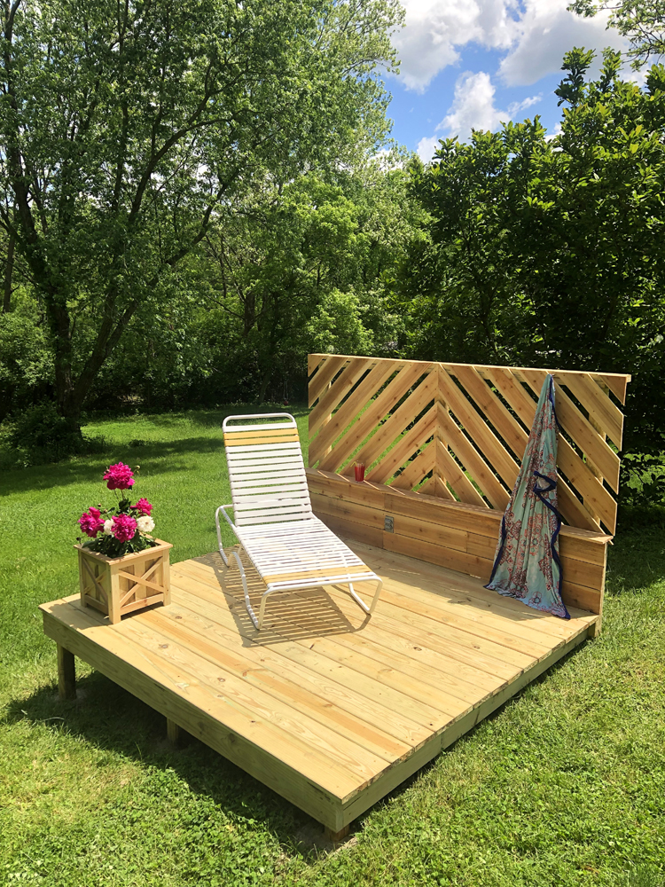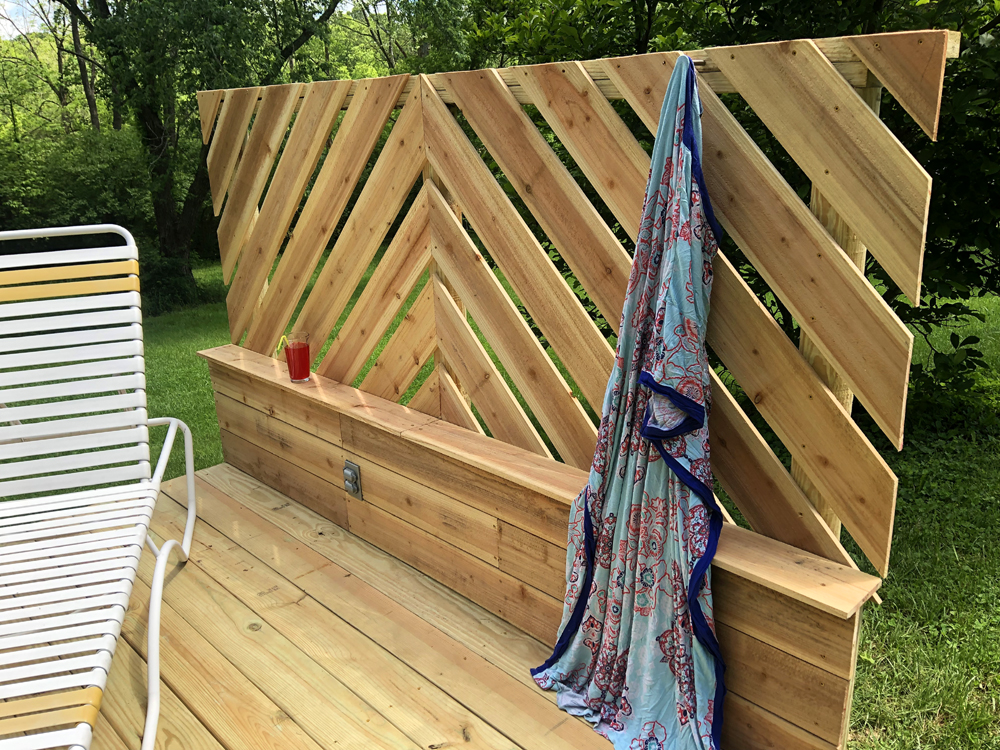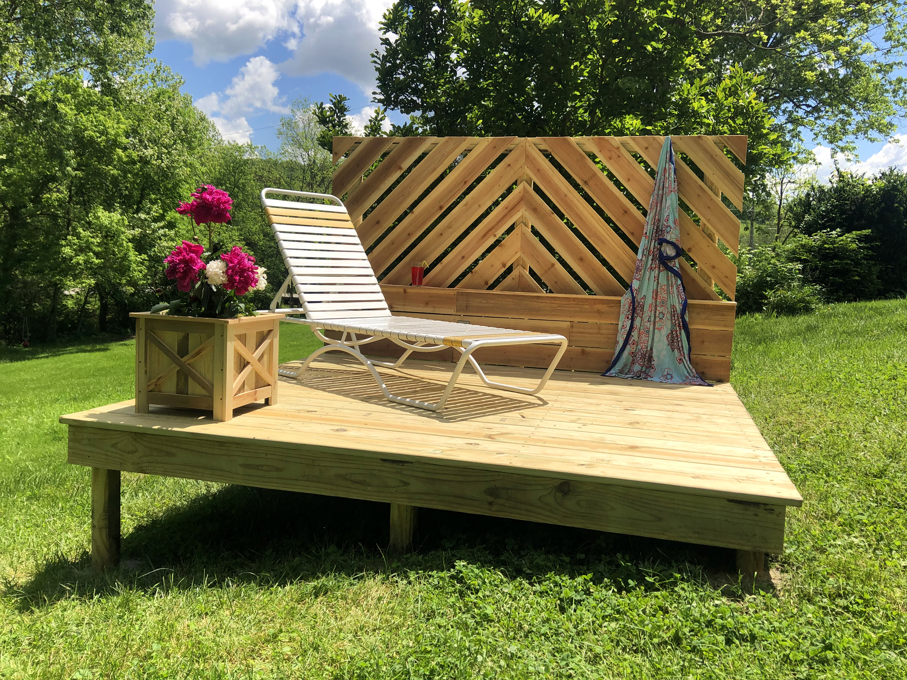 Sun bathing deck in cedar and pine with a privacy wall, shelf, power outlet and robe hook.